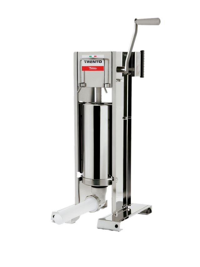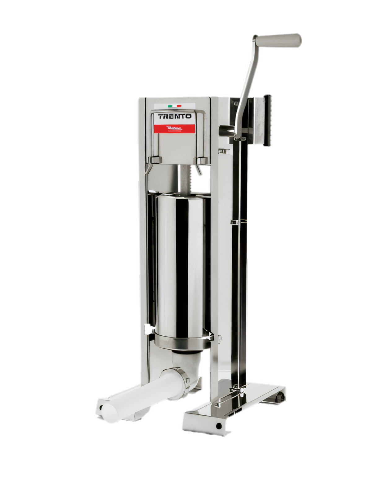 Omcan USA Trento 47716 Manual Sausage Stuffer – heavy-duty, Made in Italy construction for reliable home or commercial use. Two-speed vertical and horizontal gear drive with a stainless steel 11 lb (5 kg) cylinder and sides for easy, hygienic stuffing and durable performance. Ideal for artisanal sausage making and small-batch production.