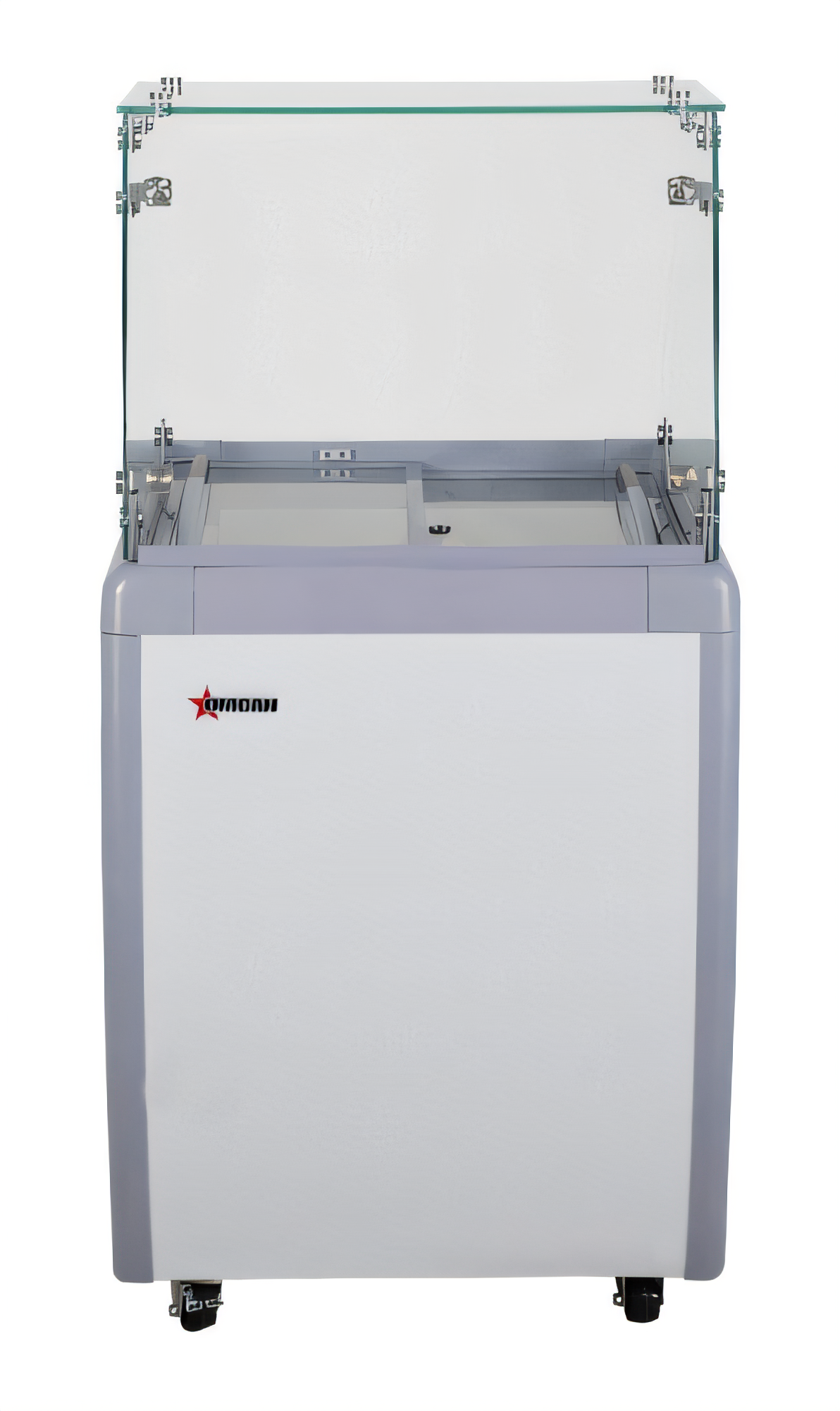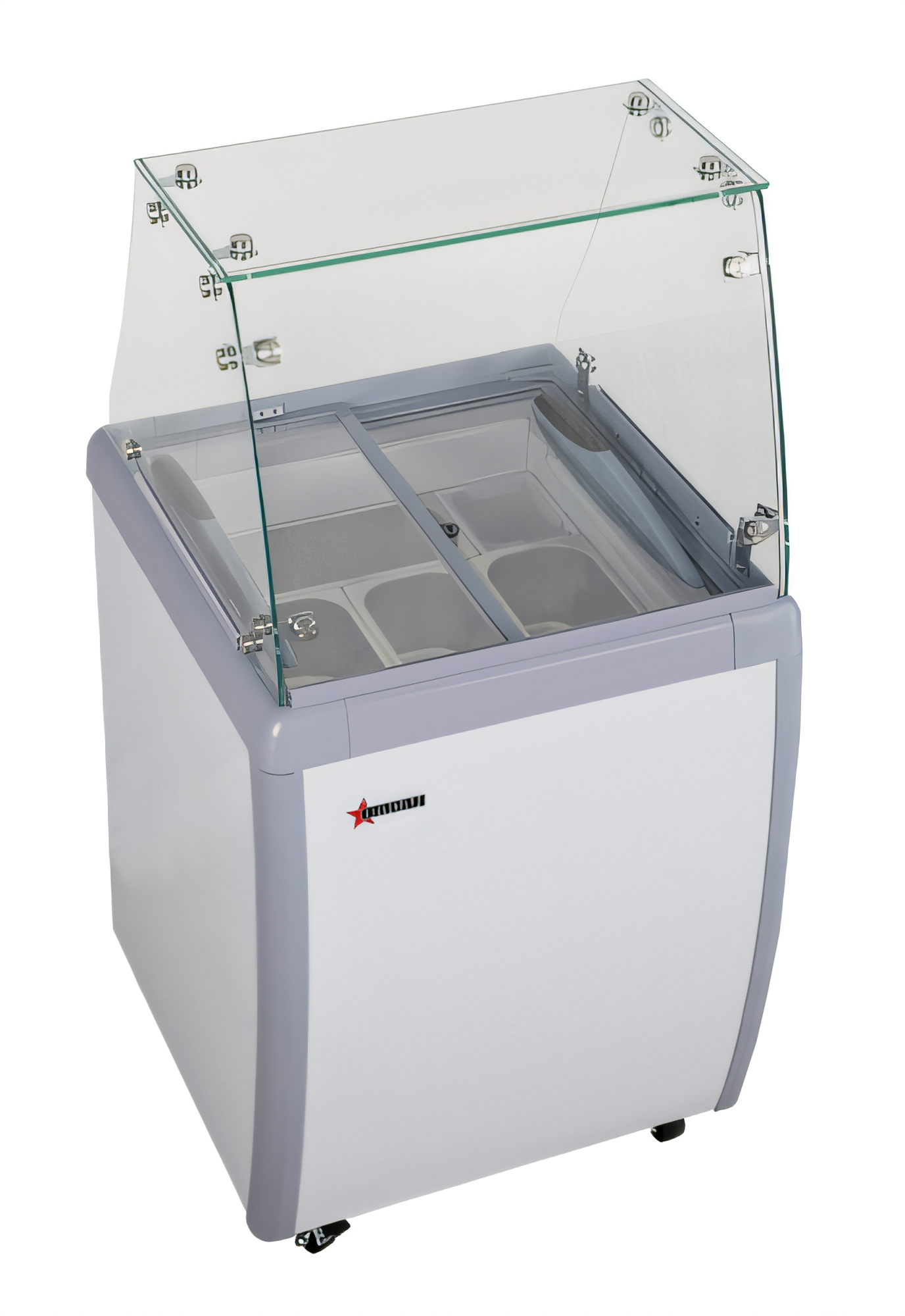 (FR-CN-0005) Gelato Display Showcase, 26"W, (4) pan capacity, flat front glass, digital controller, sliding rear doors, -15° to 32°F (-26° to 0°C) temperature range, manual defrost, R290 Hydrocarbon refrigerant, white interior & exterior, (4) casters, 210 watts, 1/4+ HP, 110v/60/1-ph, cord, 2 amps, NEMA 5-15P, cETLus, ETL Sanitation