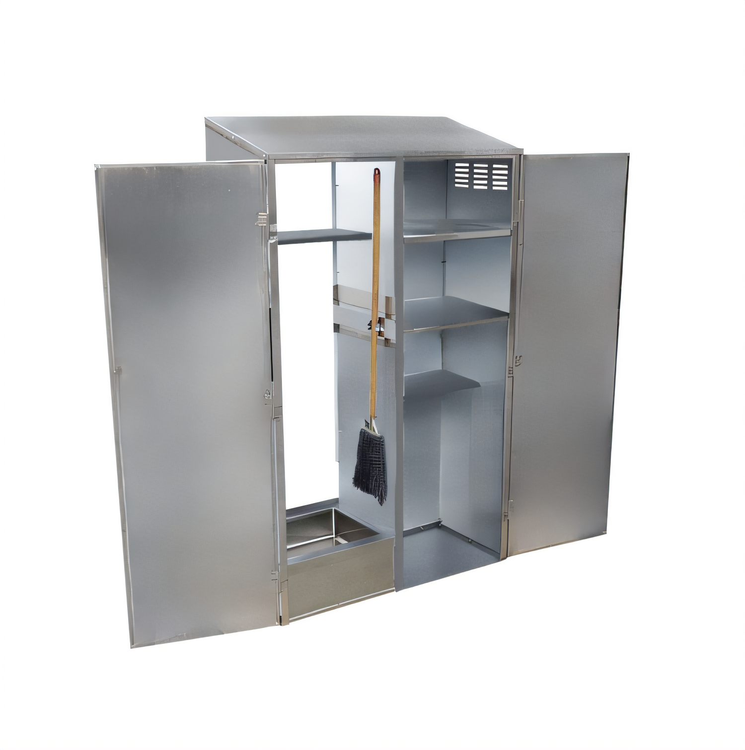 All-in-one stainless-steel storage, washing & utility stationKeep custodial areas organized, sanitary, and code-compliant with Omcan’s 2-door Janitor Cabinet featuring an integrated left-side mop sink. Built from heavy-duty 18 GA 304 stainless steel with an NSF-style 16 GA 304 sink bowl, this cabinet combines secure chemical storage, open broom space, and a fully plumbable mop basin in a single, space-saving footprint.