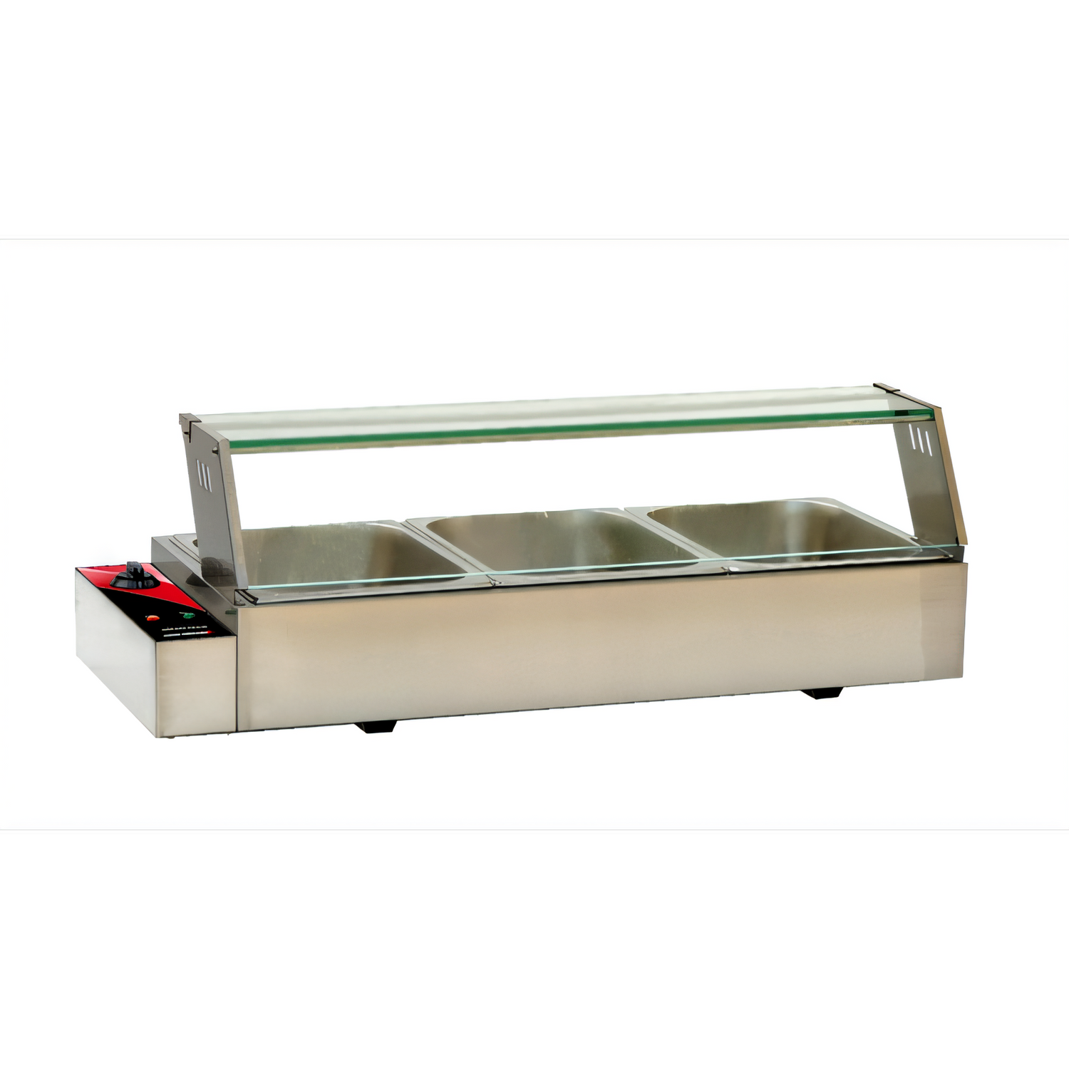 (FW-CN-0123) Bain Marie, countertop, 36"W x 14"D x 12"H, adjustable thermostatic control, 85°F and 175°F (29.4°C and 79.4°C) temperature range, includes (3) half-size pans (4" deep), clear lids, glass sneeze guard, stainless steel construction, 1.5kW, 120v/60/1-ph, cord, NEMA 5-15P, cCSAus, CSA-Sanitation (shipped on pallet)