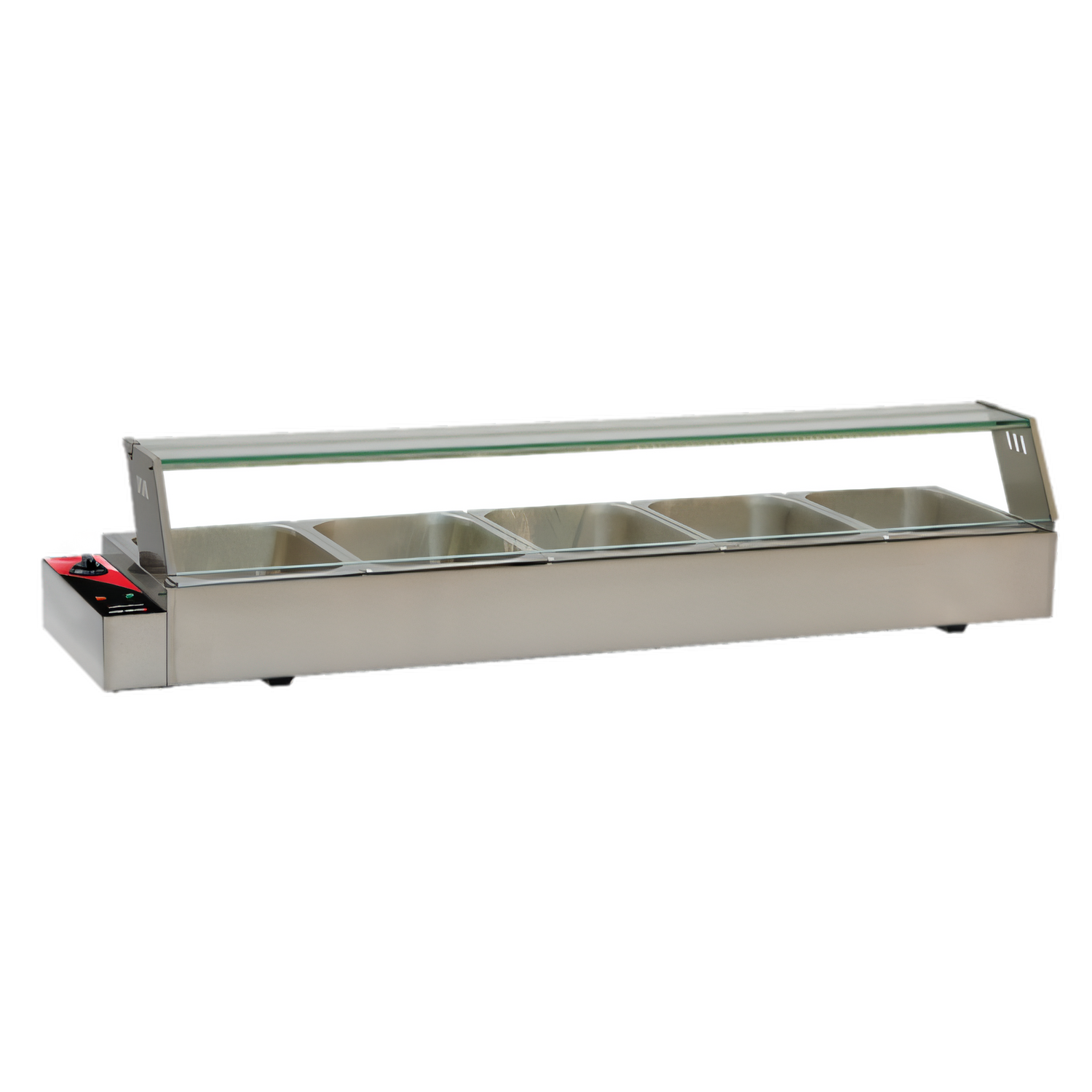 (FW-CN-0125) Bain Marie, countertop, 57"W x 14"D x 12"H, adjustable thermostatic control, 85°F and 175°F (29.4°C and 79.4°C) temperature range, includes (5) half-size pans (4" deep), clear lids, glass sneeze guard, stainless steel construction, 1.5kW, 120v/60/1-ph, cord, NEMA 5-15P, cCSAus, CSA-Sanitation (shipped on pallet)