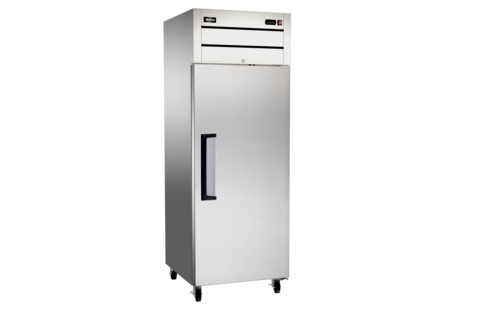 (RE-CN-0029-TM) Refrigerator, reach in, one-section, 21.5 cu. ft., top mount self-contained refrigeration, 33°F to 40°F (0.5°C to 4.4°C) temperature range, digital temperature controller, hinged solid door, (3) adjustable plastic coated shelves, LED interior lighting, automatic defrost, stainless steel interior & exterior, casters, R290 Hydrocarbon refrigerant, 115v/60/1-ph, 2.64 amps, cETLus, ETL-Sanitation, ENERGY STAR® (shipped on pallet)