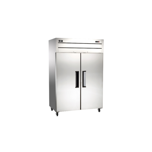 (RE-CN-0054-TM) Refrigerator, reach in, two-section, 43.1 cu. ft., top mount self-contained refrigeration, 33°F to 40°F (0.5°C to 4.4°C) temperature range, digital temperature controller, (2) hinged solid doors, (6) adjustable plastic coated shelves, LED interior lighting, automatic defrost, stainless steel interior & exterior, casters, R290 Hydrocarbon refrigerant, 115v/60/1-ph, 4.2 amps, cETLus, ETL-Sanitation, ENERGY STAR® (shipped on pallet)