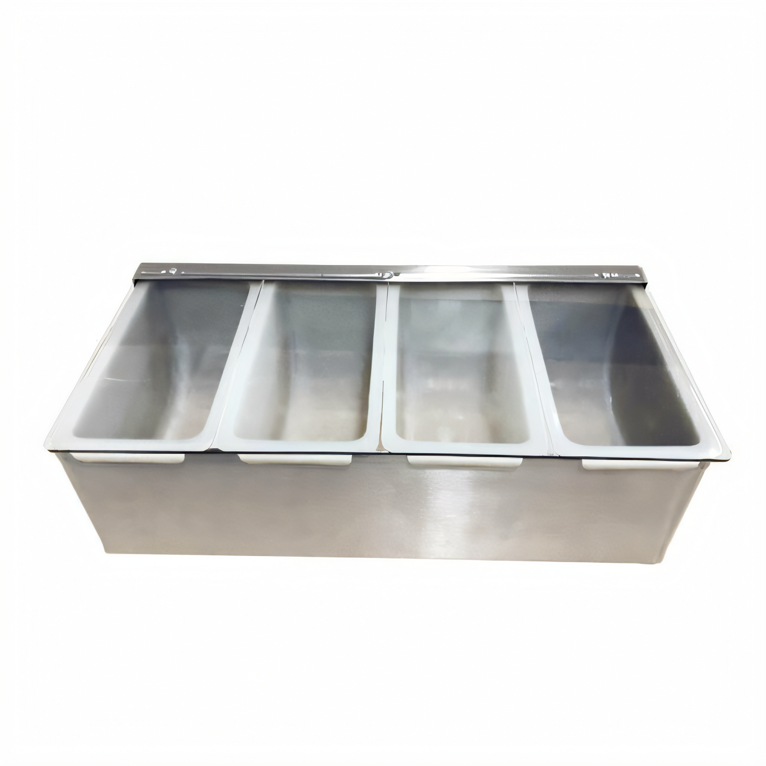 Omcan USA 80865 stainless steel 4-compartment garnish caddy with clear cover—durable, organized condiment storage for bars and kitchens.