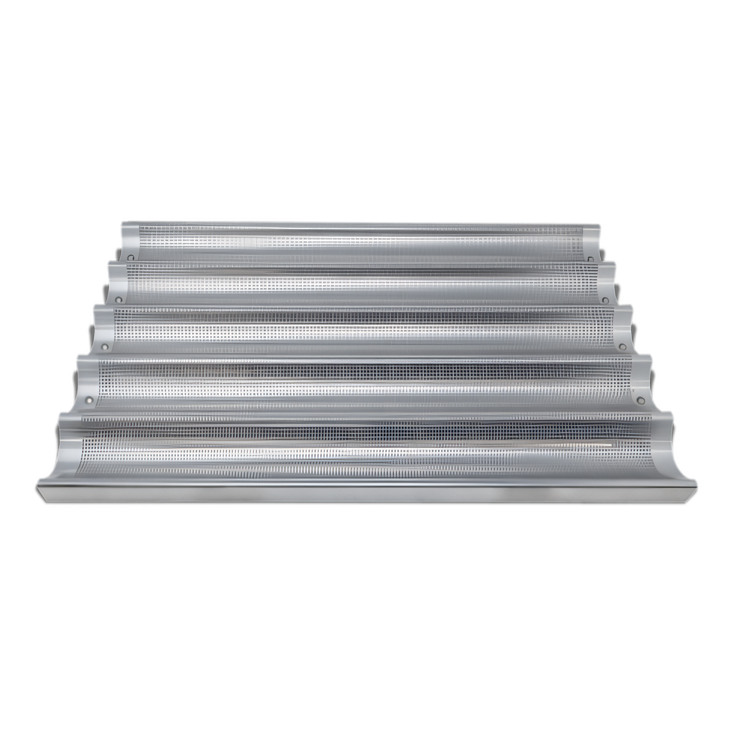 (81115) Baguette/French Bread Pan, (5) 26″ x 3″ compartments, 18" x 26" x 1-1/5" OA, perforated, glazed aluminum