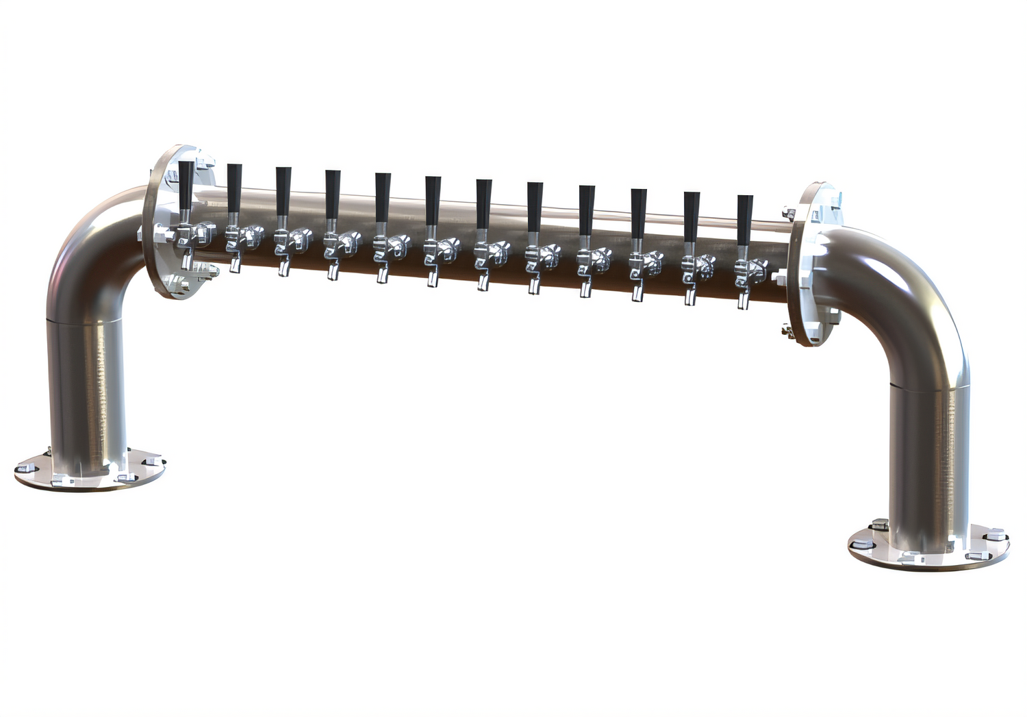 Pass-Thru Brew Pipe Draft Beer Tower, countertop, 50-1/16"W x 17-1/2"H, glycol-cooled, accommodates (10) faucets , all Perlick towers include 630SS faucets (630SSTF faucets where applicable on TF Brass and Gold Towers), 3" OC, 13-7/8" faucet clearance, foamed in place heat exchanger, concealed mounting hardware for bottom flange, (2) 5-3/4" diameter bases, polished chrome finish, beer leads left (Note: Must be combined with a full Century system quote, cannot be ordered standalone. )