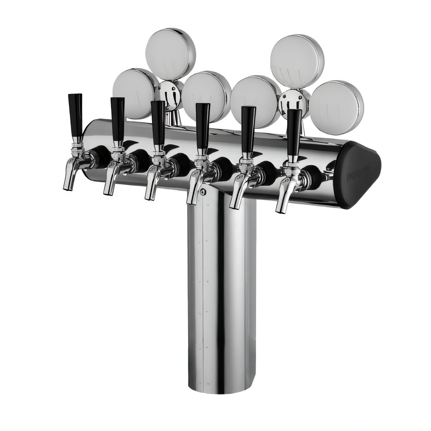Illuminated Winged Tee Draft Tower, countertop, 24-3/4"W x 22-1/4"H O.A., glycol-cooled, accommodates (8) faucets , all Perlick towers include 630SS faucets (630SSTF faucets where applicable on TF Brass and Gold Towers), 3" OC, 13" faucet clearance, (1) 4-1/16"W base, 3-3/8" diameter plug-and-play illuminated medallions with chrome trim, (3) electrical transformers, stainless steel finish, 120v/60/1-ph (Note: Must be combined with a full Century system quote, cannot be ordered standalone. )