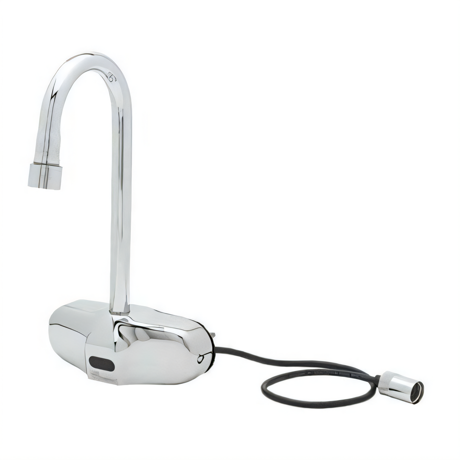 Electronic Touchless Faucet, wall-mount, 4" centers, gooseneck spout, 2.2 GPM, AC/DC control module with internal flow control, temperature control mixing valve with integral check valves, chrome-plated brass, flexible stainless steel supply hoses, Front mount spacer kit included, 1/2" inlets, NSF, UL, ADA Compliant