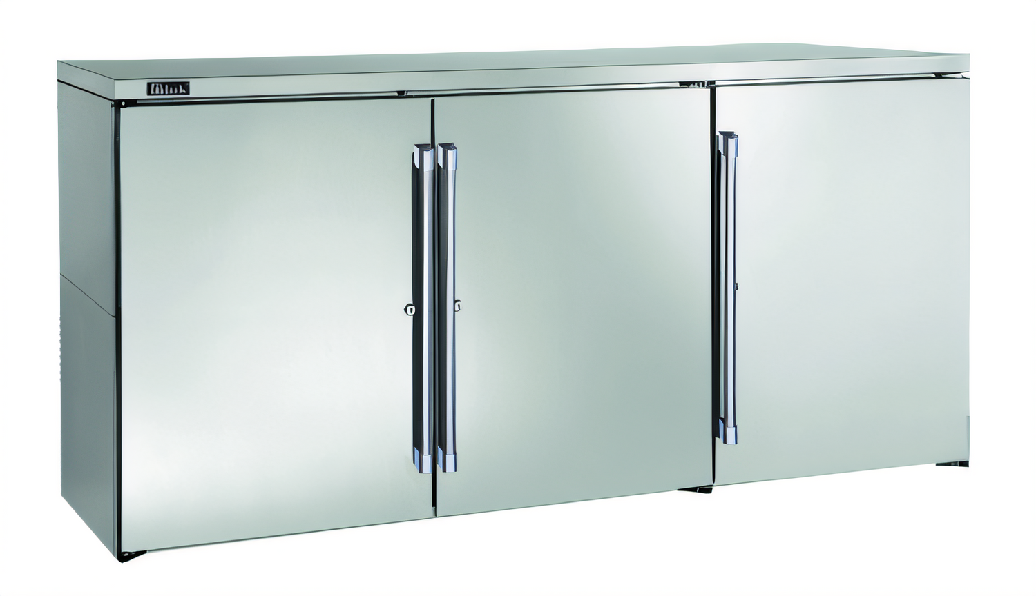 Perlick Corporation BBR72 Back Bar Cooler – 72" three-section refrigerated back bar with remote refrigeration and 23.9 cu. ft. capacity. Features three hinged, lockable doors, stainless steel interior, LED lighting, field-plumbed condensate evaporator with floor drain, and NSF/cULus listings for reliable commercial use. Ideal for bars and restaurants needing high-capacity, durable cold storage.