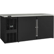 Low Profile Refrigerated Back Bar Cabinet, two-section, 48"W, remote refrigeration, 12.6 cu.ft. interior volume, (2) hinged doors with locks, LED interior lighting, field-plumbed condensate evaporator, includes floor drain, stainless steel interior, NSF, cULus. Black exterior.