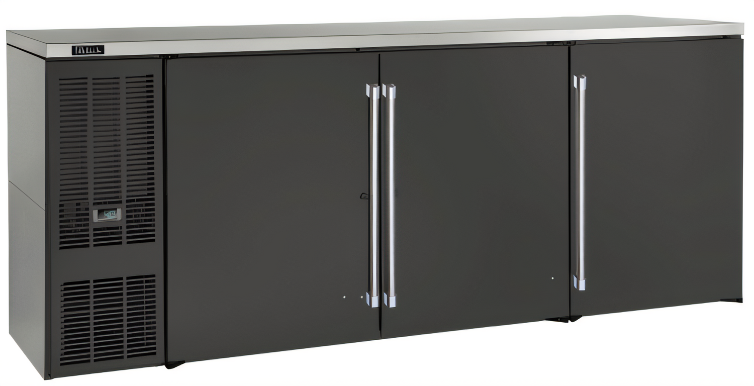 (QuickShip) Refrigerated Back Bar Cabinet, three-section, 84"W, self-contained refrigeration, 24.8 cu.ft. internal volume, black vinyl clad front, (3) solid hinged doors with locks (hinge order: Left - Left - Right), (2) vinyl-coated shelves & (1) floor shelf per section, digital thermostat, LED interior lighting, front vented, automatic defrost & condensate evaporator, includes floor drain, R290 Hydrocarbon refrigerant, stainless steel interior, 1/4 HP, R290 Hydrocarbon refrigerant, NSF, cULus