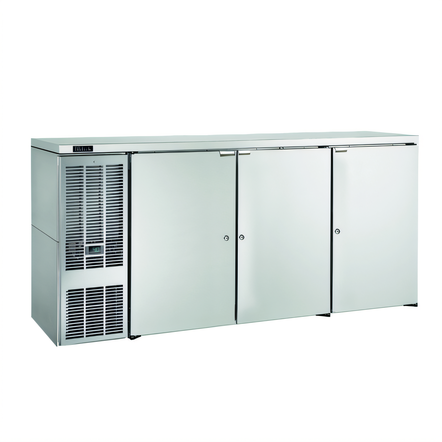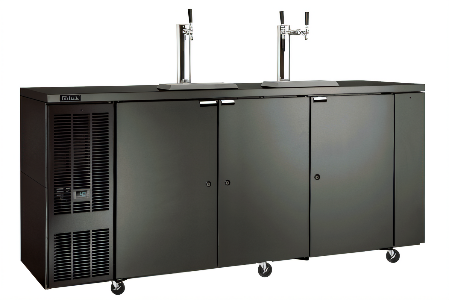 Direct Draw Draft Beer Dispenser, three-section, 84"W, self-contained refrigeration, holds (4) half barrels (LESS TAPPING), 33-40°F temperature range, (3) solid doors, digital thermostat, front vented, automatic defrost & evaporator condensate, automatic defrost & condensate evaporator, includes floor drain, stainless steel top, ends & back exterior, 1/4 HP, R290 Hydrocarbon refrigerant, NSF, cULus