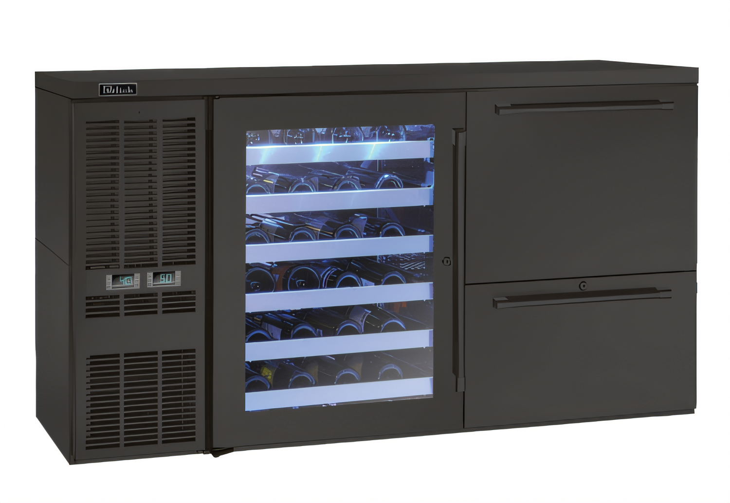 Dual-Zone Refrigerated Back Bar Storage Cabinet, two-section, 60"W, self-contained refrigeration, 15.0 cu.ft. interior capacity, digital thermostat, LED interior lighting, door locks, front vented, automatic defrost & condensate evaporator, includes floor drain, stainless steel interior, side mount compressor, 1/5 HP, R290 Hydrocarbon refrigerant, NSF, cULus