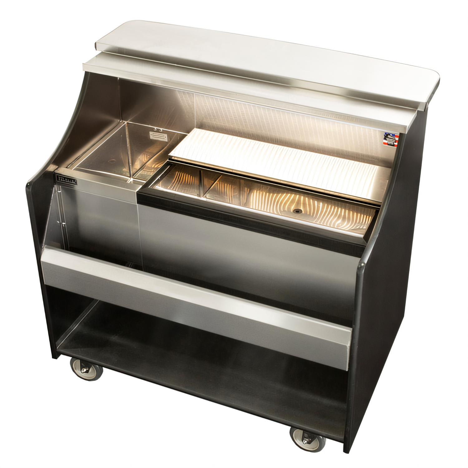 Mobile Bar, 42" total bartending width, 30" ice chest, 12" insulated bottle well, 42" speed rail, dimmable LED bartender task lighting, ice melt drain tank, stainless steel & laminated wood construction, (4) 5" stainless steel casters (locking), 120v/60/1-ph, 0.3 amps, NEMA 5-15P, NSF
