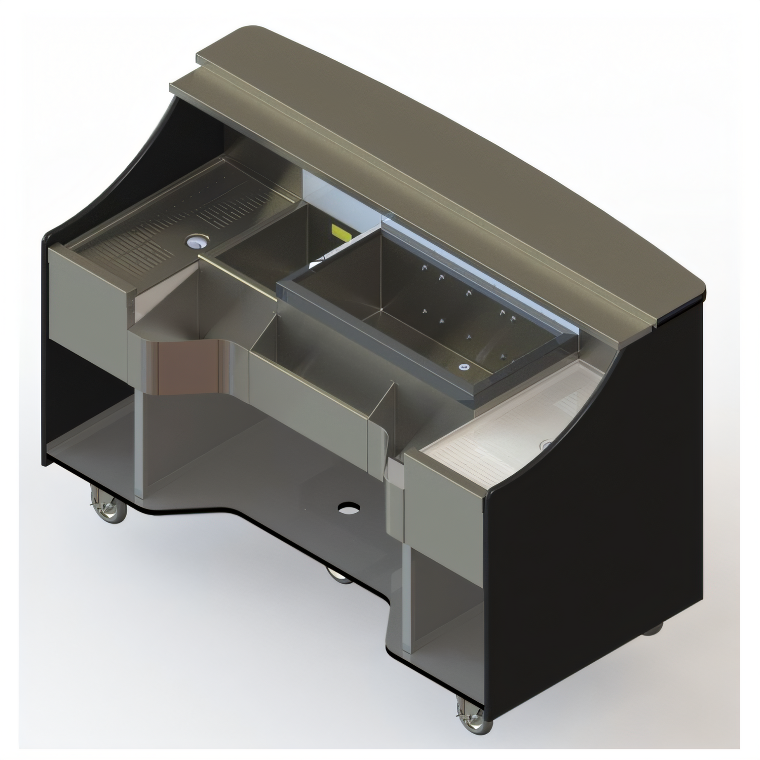 Signature Series Mobile Bar, 66" total bartending width, 30" ice chest, 12" insulated bottle well, (2) 12" drainboards, 66" curved speed rail, dimmable LED bartender task lighting, ice melt drain tank, stainless steel & laminated wood construction, (6) 5" stainless steel casters (locking), 120v/60/1-ph, 0.4 amps, NEMA 5-15P, NSF