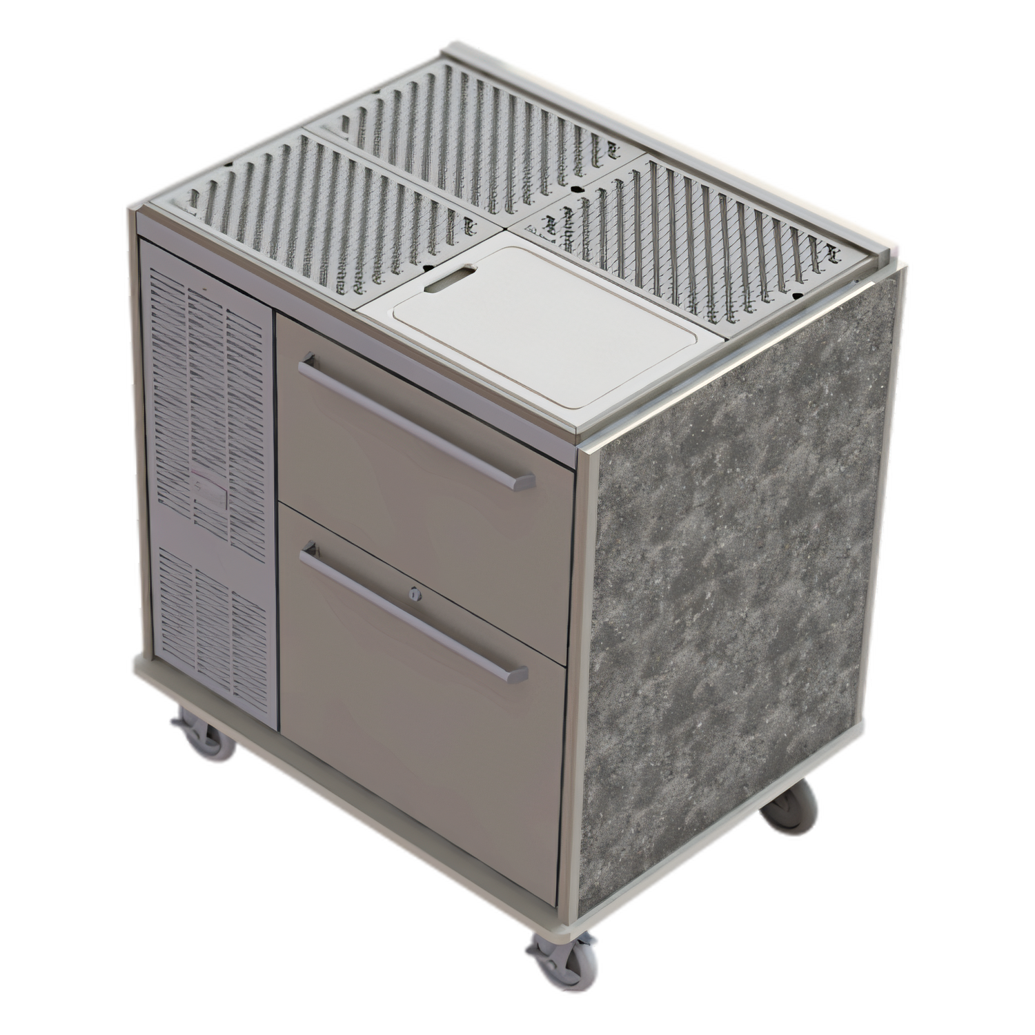 Signature Series Mobile Bar Refrigerated Cabinet, 7.4 cu.ft. volume, drainboard top with (3) perforated glass racks, cutting board & 1" NPS drain, (2) drawers with handles, digital thermostat, LED interior lighting, front vented, automatic defrost & evaporator condensate, laminated exterior, stainless steel casters, R290 Hydrocarbon refrigerant, 1/6 HP, 120v/60/1-ph, 1.8 amps, NEMA 5-15, cULus, NSF