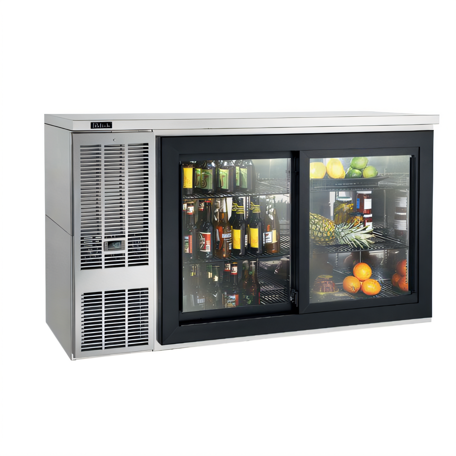 Sliding Door Refrigerated Back Bar Cabinet, two-section, 60"W, self-contained side mount refrigeration, 14.8 cu.ft. internal volume, (2) sliding glass doors with locks, digital thermostat, LED interior lighting, front vented, automatic defrost & condensate evaporator, includes floor drain, stainless steel interior, side mount compressor, 1/5 HP, R290 Hydrocarbon refrigerant, NSF, cULus