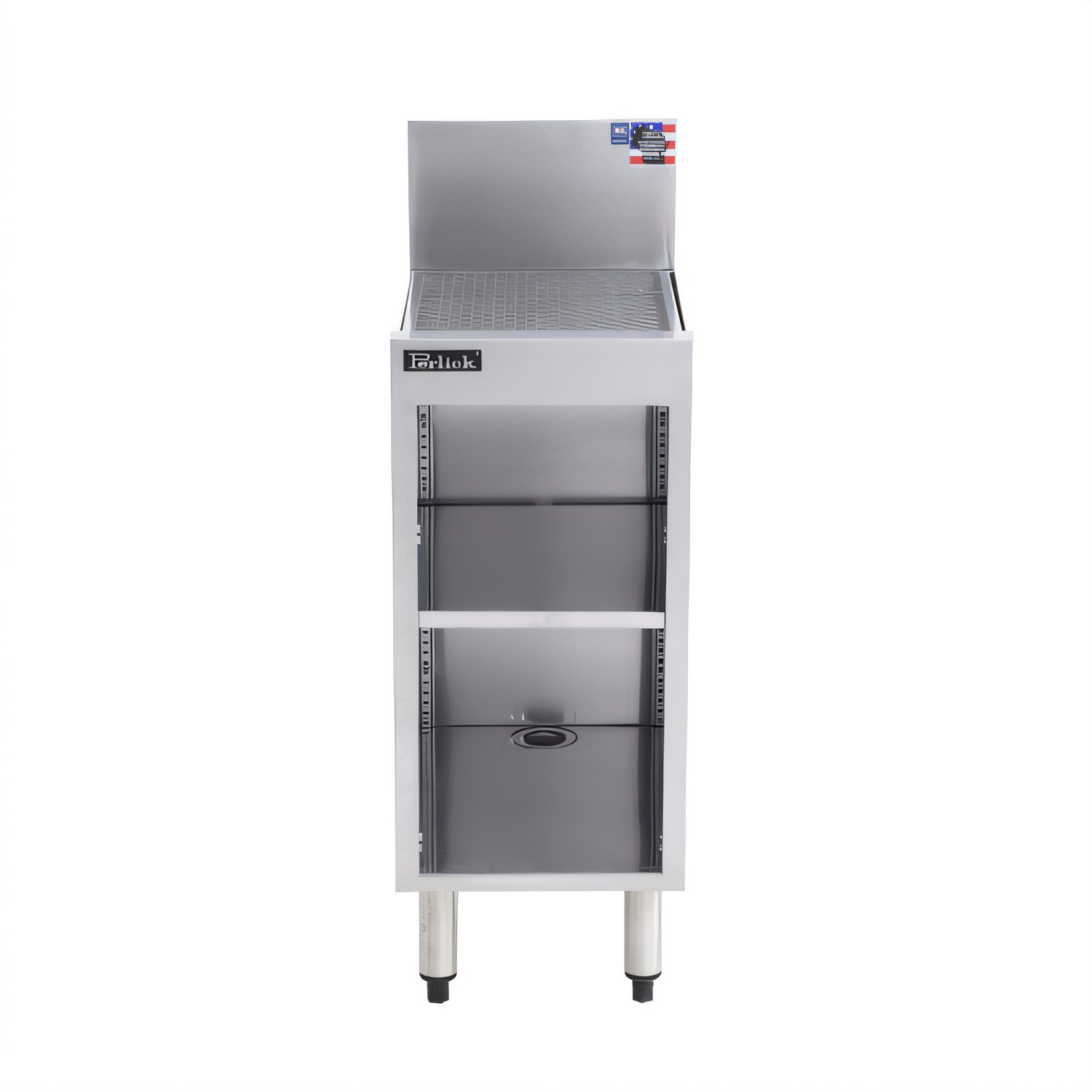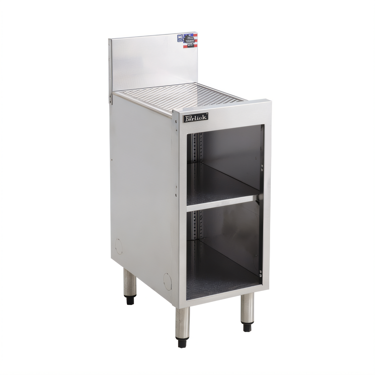 Underbar Storage Cabinet 12"W x 18-9/16"D, 4" or 6"H backsplash with 1" return at top, pitched drainboard top with 1-1/2" NPS drain socket with 1/2" OD barb & 1/2" ID anti-microbial tubing, 1-1/2" NPS male drain center back of cabinet bottom, adjustable intermediate shelf, stainless steel construction, Perlick Quick Clamp stainless steel legs & adjustable feet, NSF Listed (replaces SC12-18)
