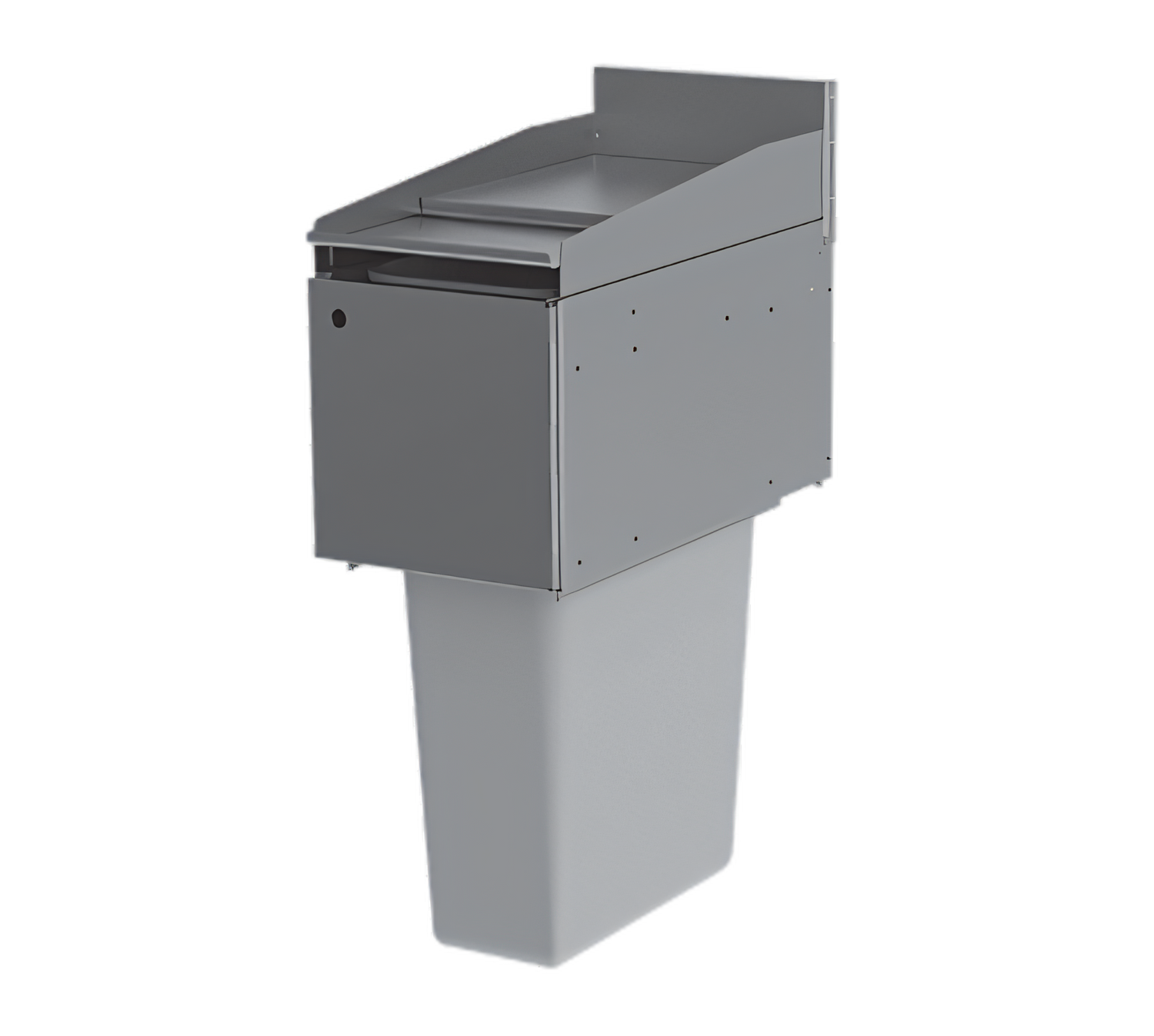 TS Series Trash Receptacle Top Cover, 12"W x 23-13/16"D x 17-15/16"H, stainless steel construction (wastebasket is not included), 6"H backsplash, sliding top cover, hinged door on front apron (requires support by adjacent structure, underbar equipment or accessory end panel & leg kit. Leg kit can be used on ONE side only)