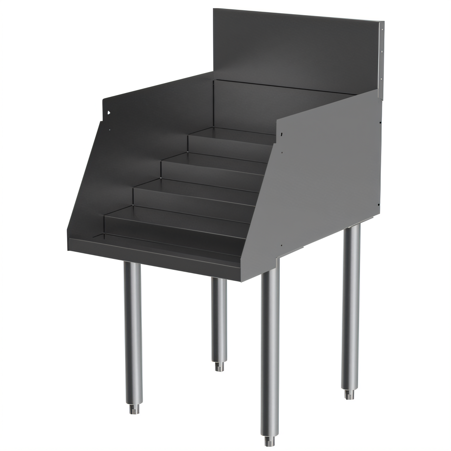 TS Series Liquor Bottle Display Unit, modular, 18" wide, 24" front-to-back, with 3-7/8" deep steps, stainless steel construction