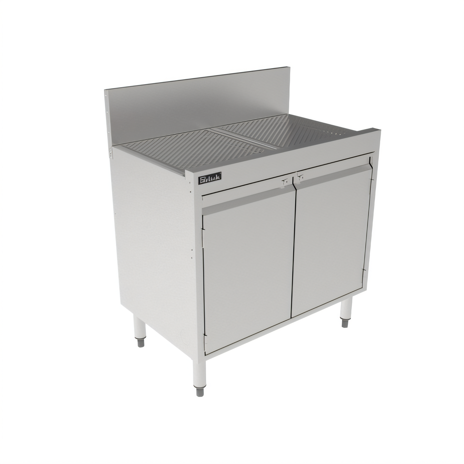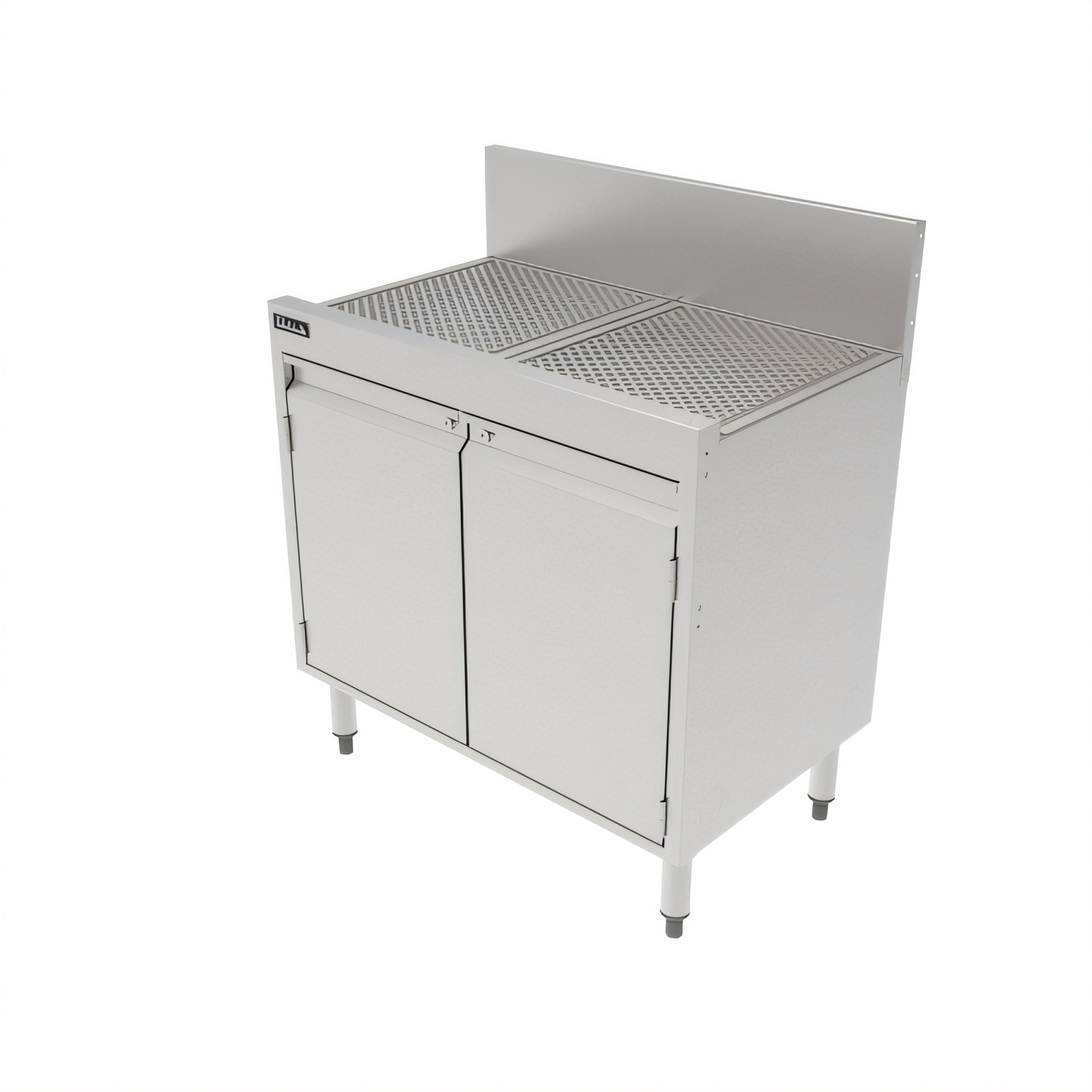 Underbar Storage Cabinet 30"W x 18-9/16"D, 4" or 6"H backsplash with 1" return at top, pitched drainboard top with 1-1/2" NPS drain socket with 1/2" OD barb & 1/2" ID anti-microbial tubing, 1-1/2" NPS male drain center back of cabinet bottom, adjustable intermediate shelf, stainless steel construction, Perlick Quick Clamp stainless steel legs & adjustable feet, NSF Listed (replaces SC30-18)