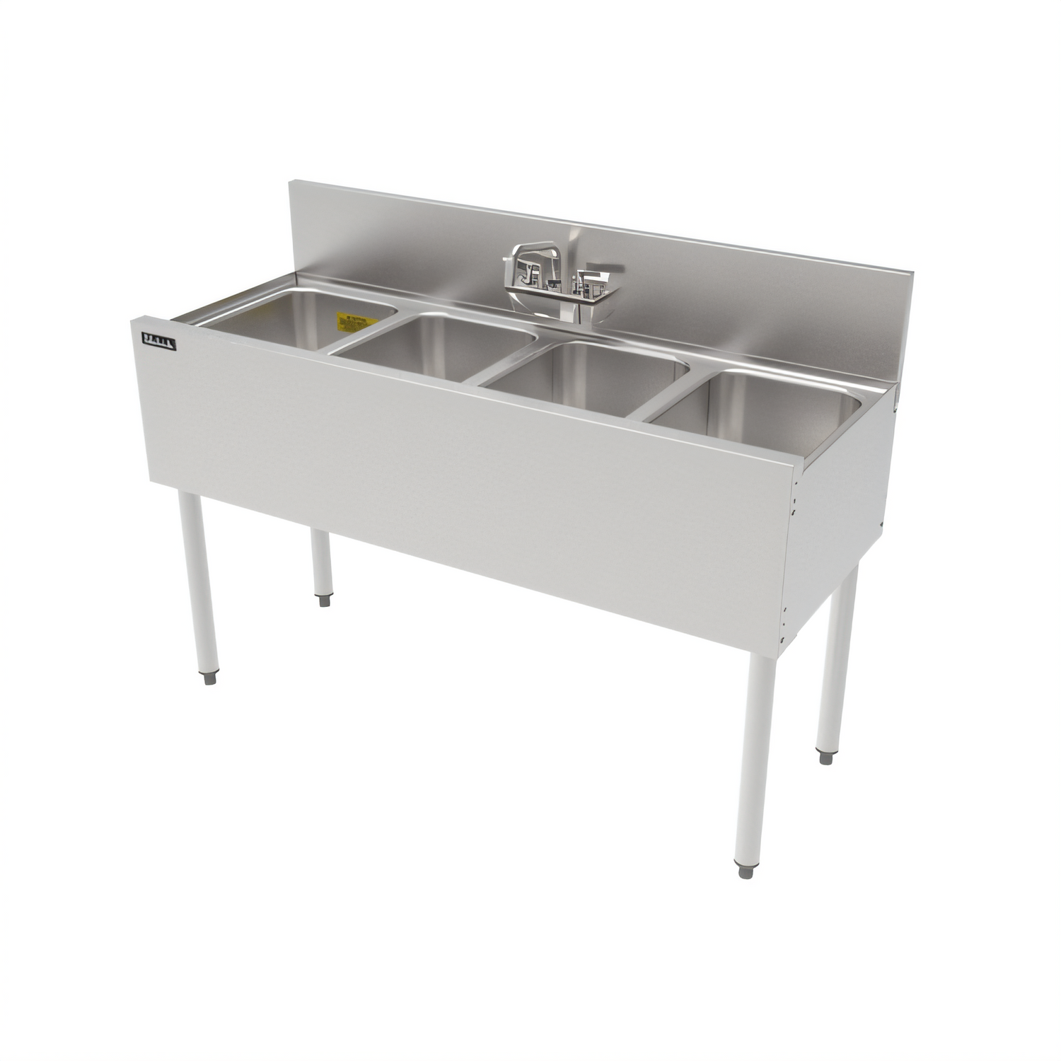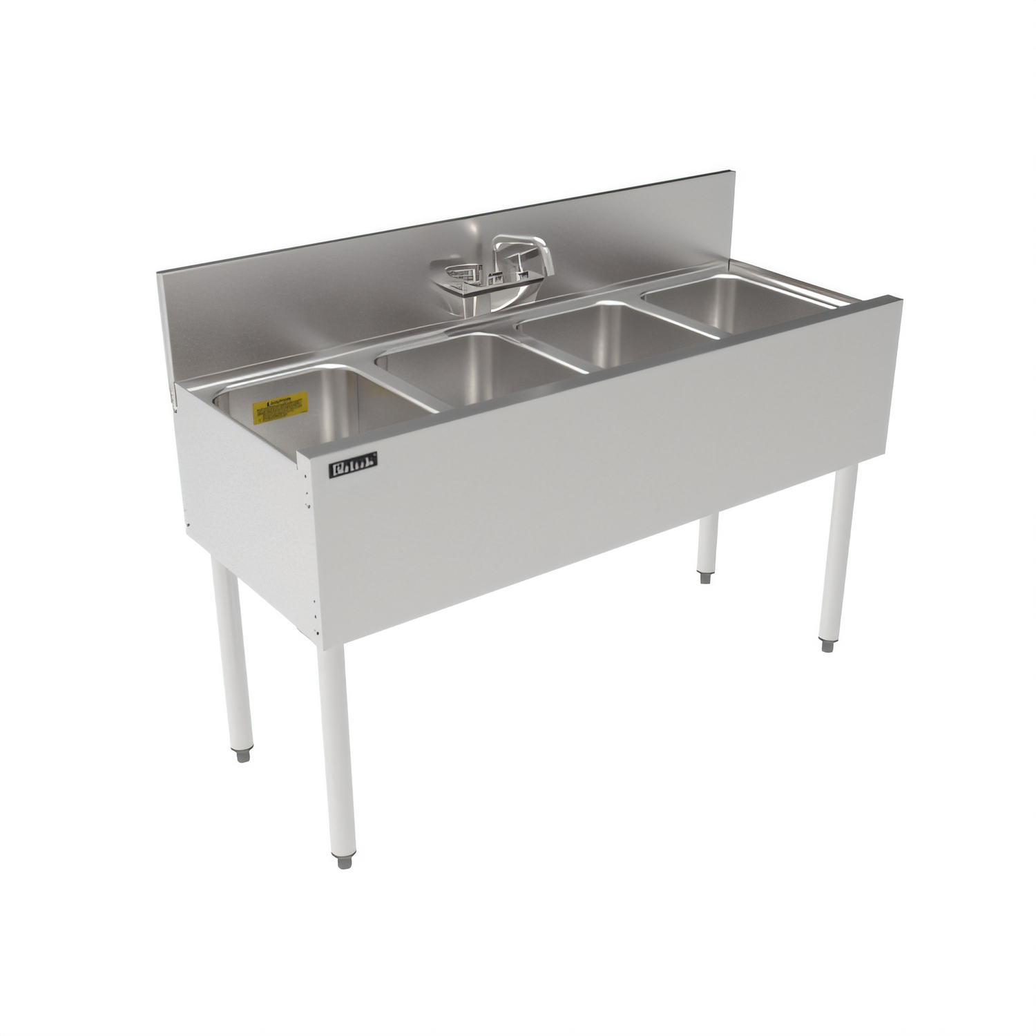 TS Series Underbar Multi-tank Sink Unit, four 18 gauge stainless steel compartment, 48"W x 18-9/16"D, backsplash, 10" wide x 14" front-to-back x 9-1/4" deep compartments, 4" OC (TS) splash or (TSF) deck mount faucet holes, seamless front apron, includes 1-1/2" drains & 8-1/2" removable overflow standpipes, stainless steel construction, Perlick Quick Clamp tool less leg attachment, stainless steel legs with adjustable thermoplastic feet (replaces TS44C)
