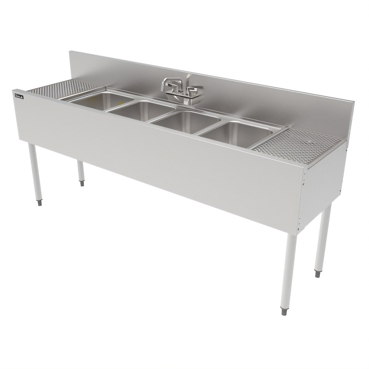 TS Series Underbar Multi-tank Sink Unit, four 18 gauge stainless steel compartment, 72"W x 18-9/16"D, backsplash, 10" wide x 14" front-to-back x 9-1/4" deep compartments, 12" pitched drainboards on left & right, 4" OC (TS) splash or (TSF) deck mount faucet holes, seamless front apron, includes 1-1/2" drains & 8-1/2" removable overflow standpipes, stainless steel construction, Perlick Quick Clamp tool less leg attachment, stainless steel legs with adjustable thermoplastic feet (replaces TS64C)