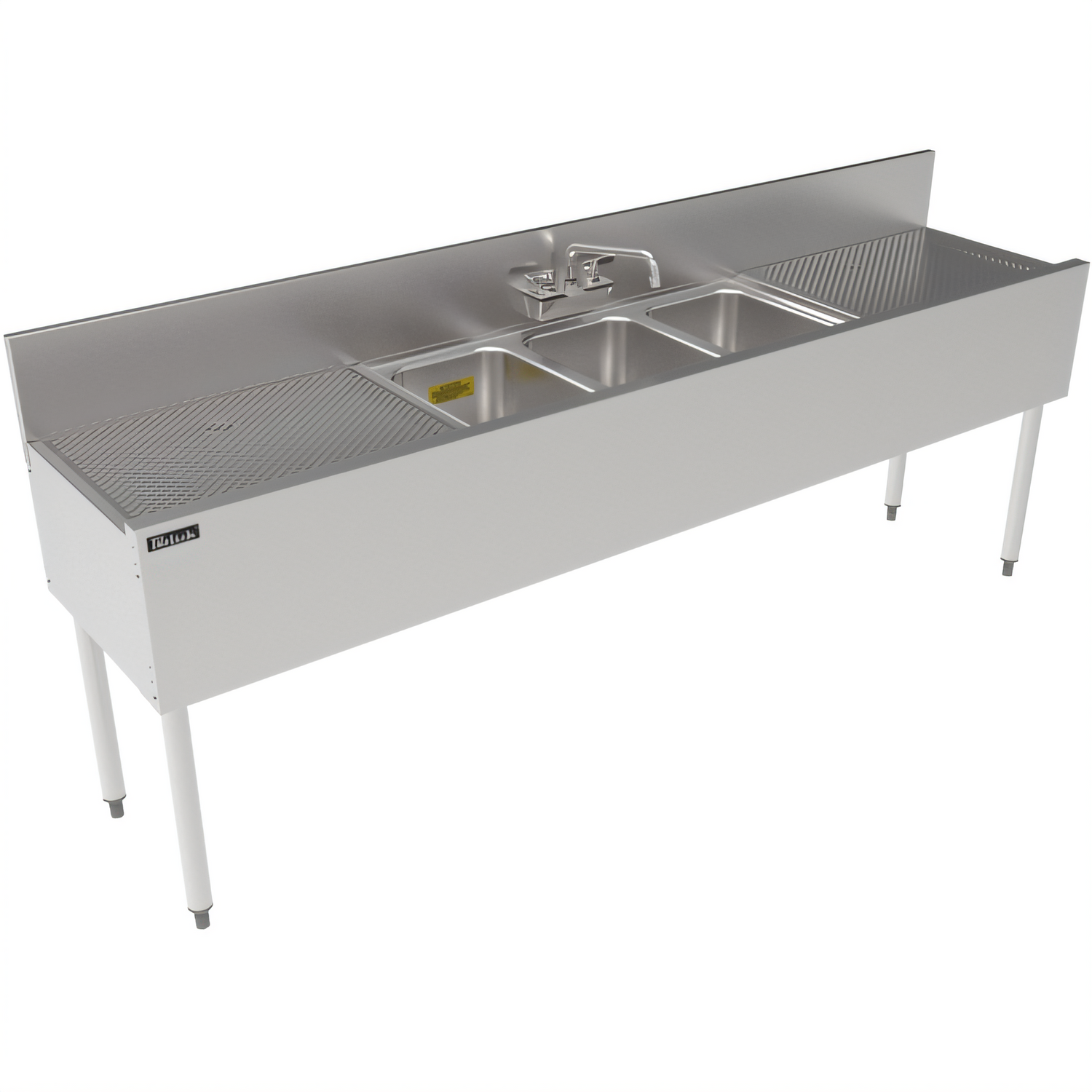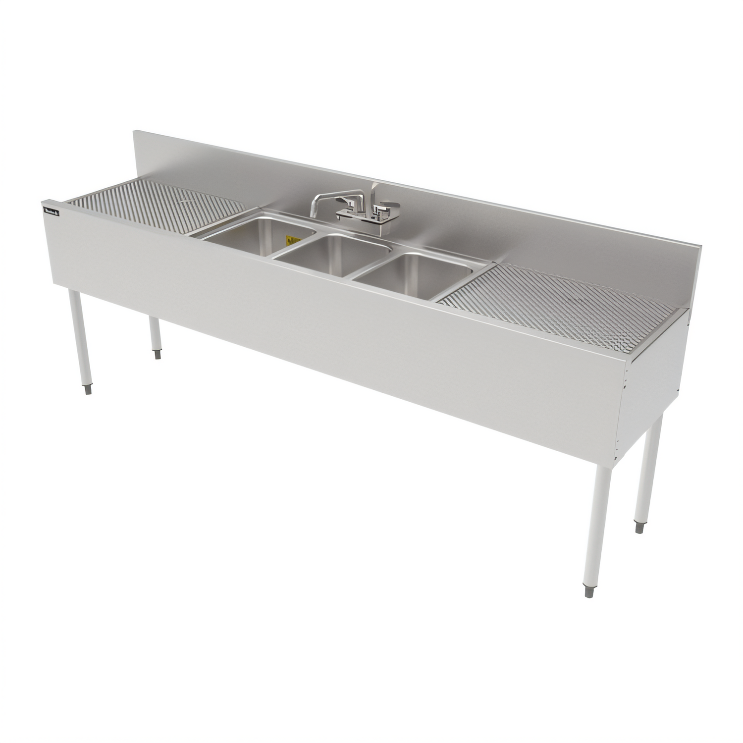 TS Series Underbar Multi-tank Sink Unit, three 18 gauge stainless steel compartment, 84"W x 18-9/16"D, backsplash, 10" wide x 14" front-to-back x 9-1/4" deep compartments, 24" pitched drainboard top on left & right, 4" OC (TS) splash or (TSF) deck mount faucet holes, seamless 18 gauge stainless steel front apron, includes 1-1/2" drains & 8-1/2" removable overflow standpipes, stainless steel construction, Perlick Quick Clamp tool less leg attachment, stainless steel legs with adjustable thermoplastic feet (replaces TS73C)
