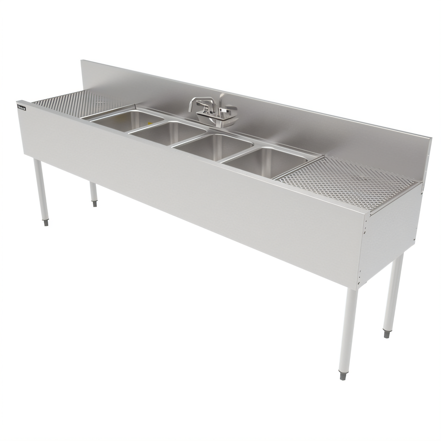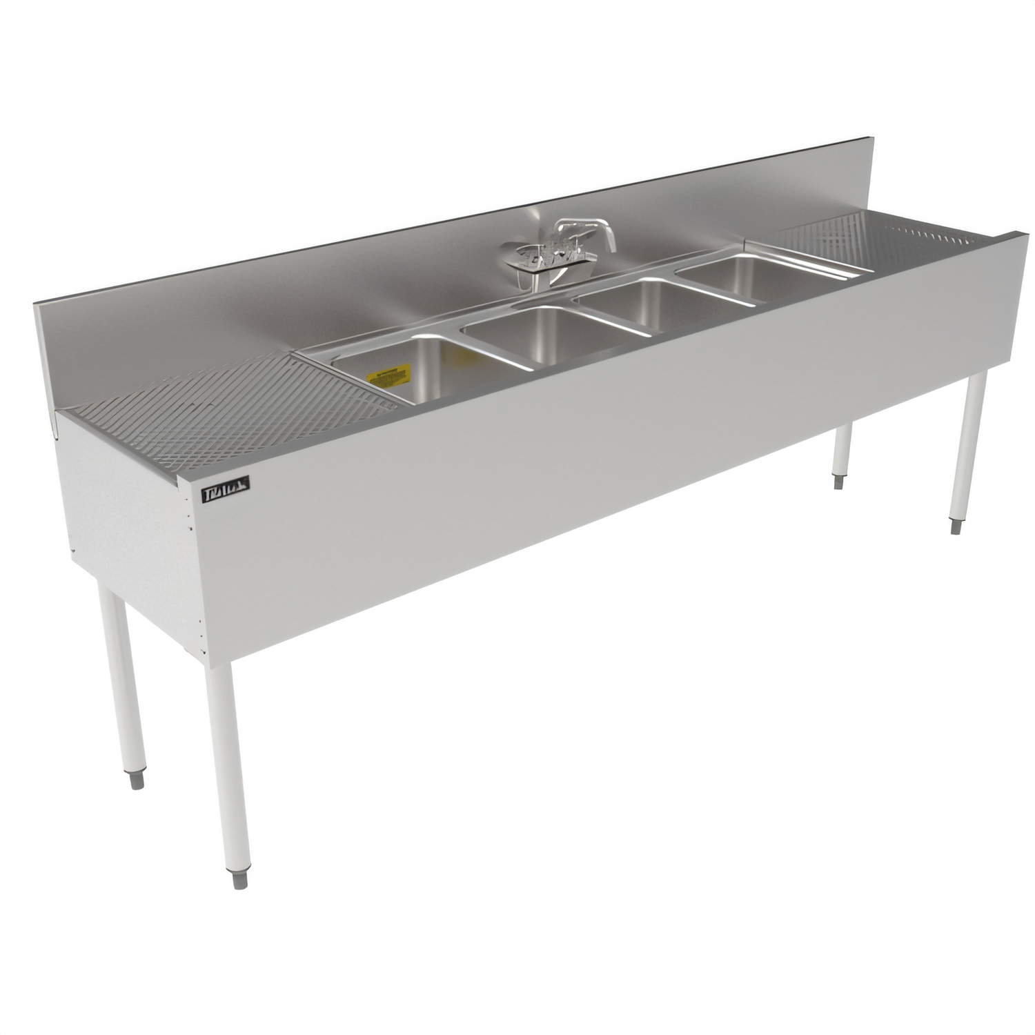 TS Series Underbar Multi-tank Sink Unit, four 18 gauge stainless steel compartment, 84"W x 18-9/16"D, backsplash, 10" wide x 14" front-to-back x 9-1/4" deep compartments, 18" pitched drainboards on left & right, 4" OC (TS) splash or (TSF) deck mount faucet holes, seamless front apron, includes 1-1/2" drains & 8-1/2" removable overflow standpipes, stainless steel construction, Perlick Quick Clamp tool less leg attachment, stainless steel legs with adjustable thermoplastic feet (replaces TS74C)