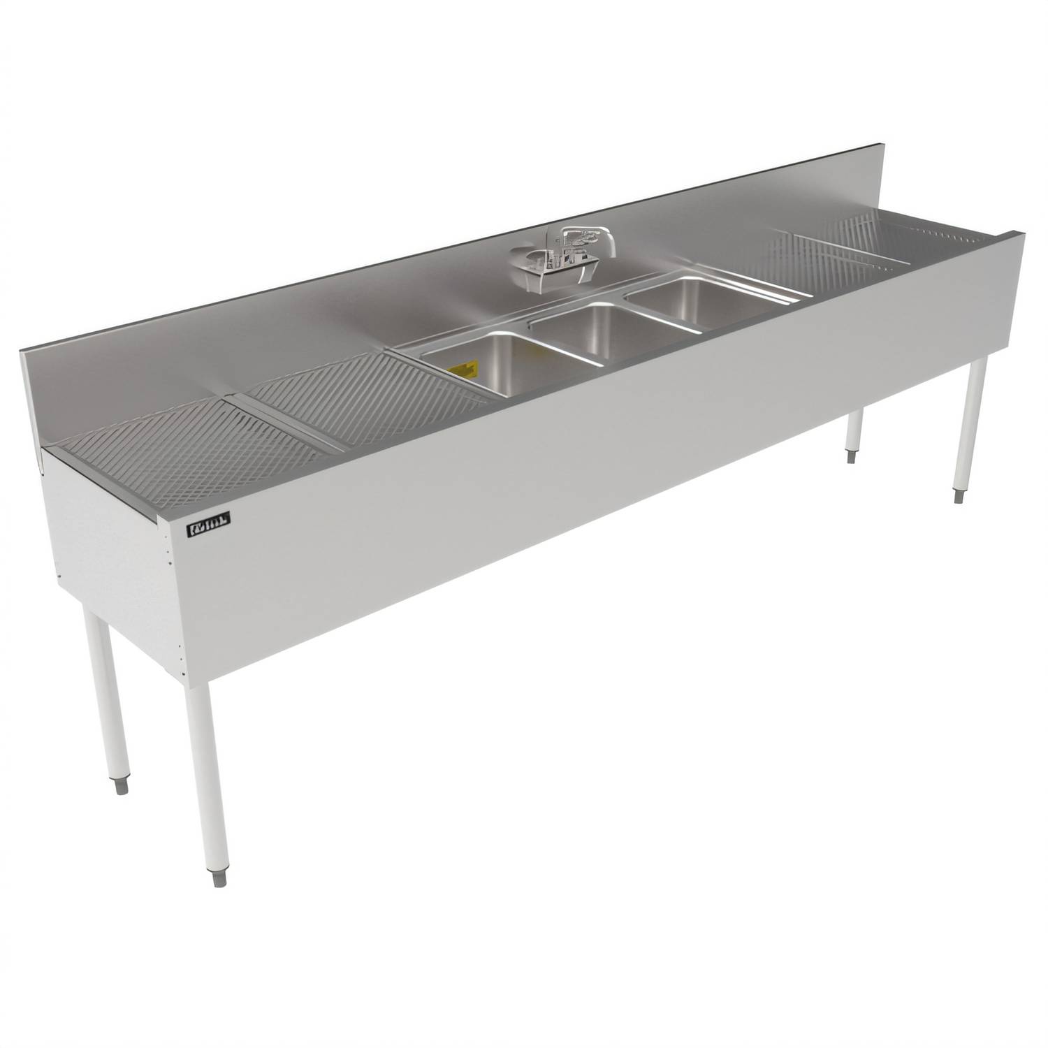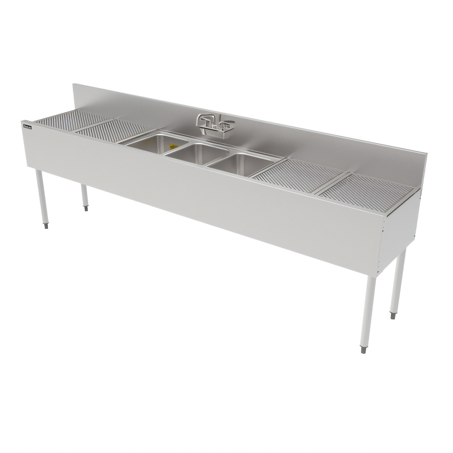 TS Series Underbar Multi-tank Sink Unit, three 18 gauge stainless steel compartment, 96"W x 18-9/16"D, backsplash, 10" wide x 14" front-to-back x 9-1/4" deep compartments, 30" pitched drainboard top on left & right, 4" OC (TS) splash or (TSF) deck mount faucet holes, seamless 18 gauge stainless steel front apron, includes 1-1/2" drains & 8-1/2" removable overflow standpipes, stainless steel construction, Perlick Quick Clamp tool less leg attachment, stainless steel legs with adjustable thermoplastic feet (replaces TS83C)