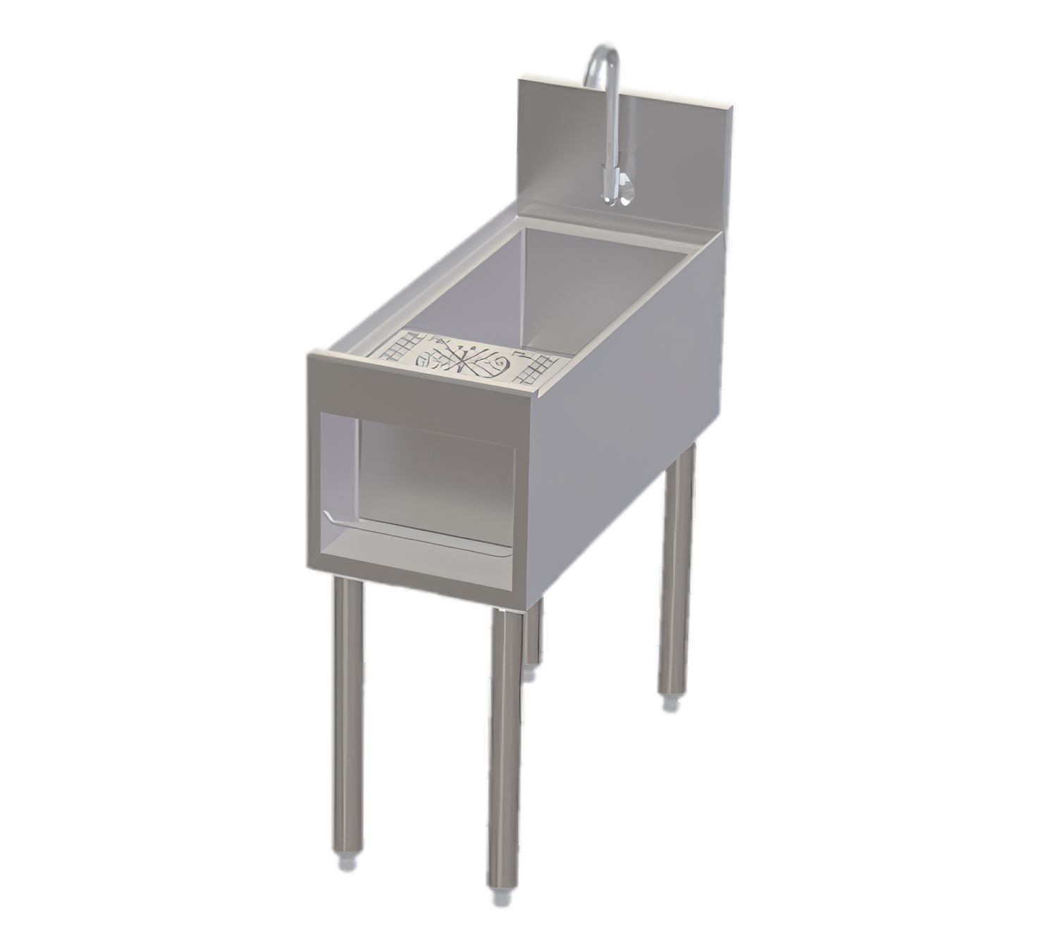 Tobin Ellis Signature Underbar Utility sink, with glass rinser, 12"W, freestanding, 6"H backsplash with 1" return, 9-1/2" wide x 16-5/16" front-to-back x 7-3/16" deep sink bowl with 1-1/2" drain, sound-deadened underside, integrated drip pan with 4-3/8" dia. stainless steel glass rinser (NSF) & "water fall" drainage into sink, includes removable perforated glass rack, recessed cubby on front with wire bottle holder, stainless steel construction, stainless steel legs with adjustable thermoplastic feet