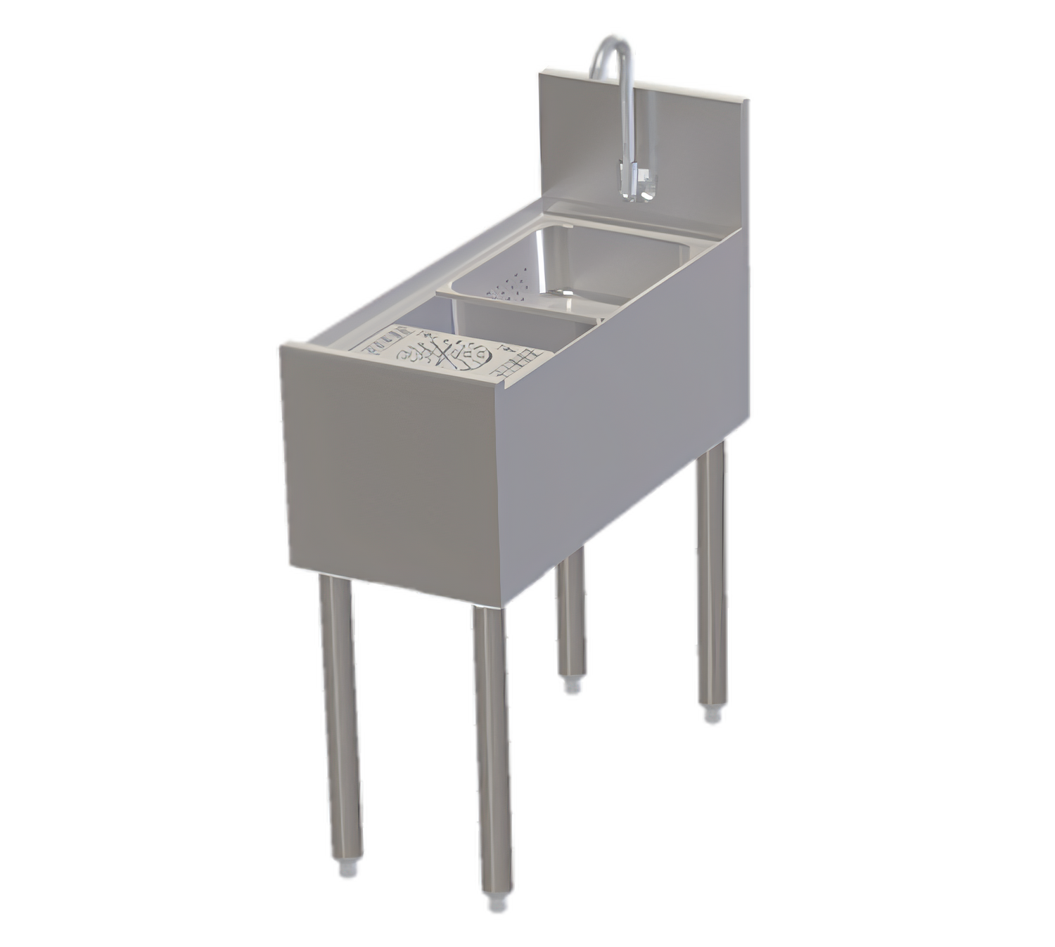 Tobin Ellis Signature Underbar Utility sink, with glass rinser, 12"W, freestanding, 6"H backsplash with 1" return, 9-1/2" wide x 16-5/16" front-to-back x 7-3/16" deep sink bowl with 1-1/2" drain, sound-deadened underside, integrated drip pan with 4-3/8" dia. stainless steel glass rinser (NSF) & "water fall" drainage into sink, includes removable perforated glass rack, stainless steel construction, stainless steel legs with adjustable thermoplastic feet