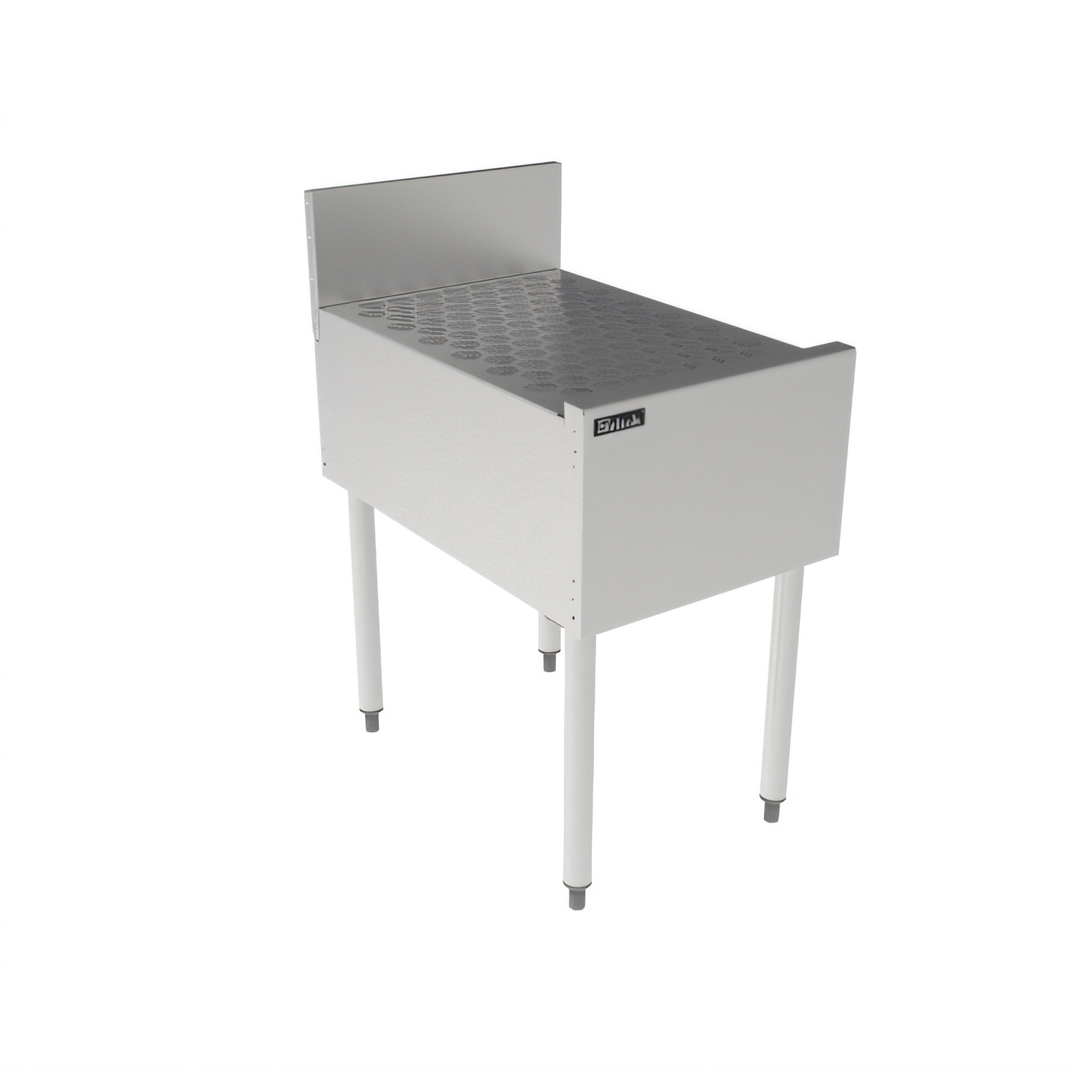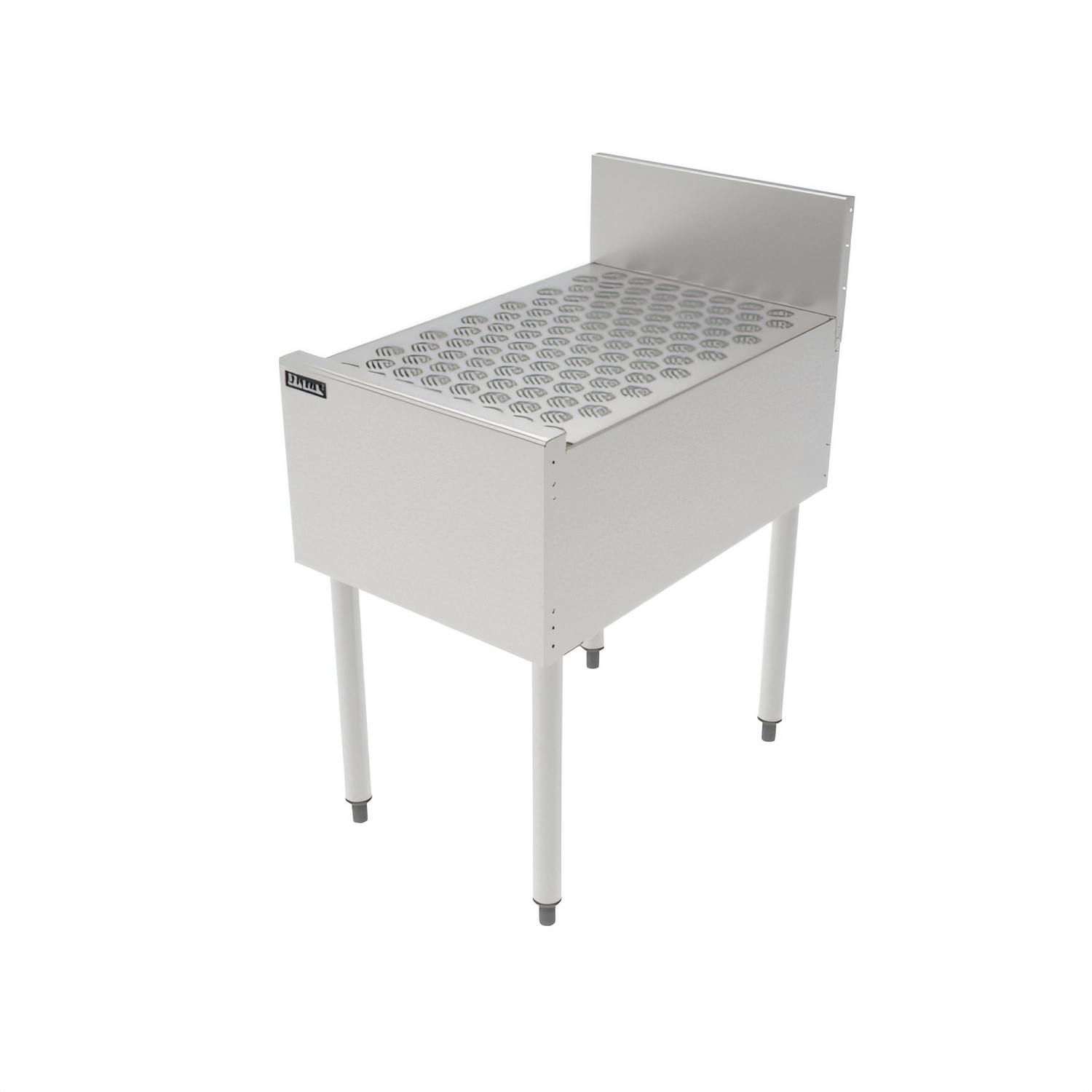 TSCE Series Underbar Drainboard, 18"W x 27-5/8"D, pitched drainboard top, (1) 18"W 'Honeycomb' shaped 18 gauge stainless steel perforated glass rack insert, all stainless steel construction, backsplash, Perlick Quick Clamp tool less leg attachment, stainless steel legs with adjustable thermoplastic feet