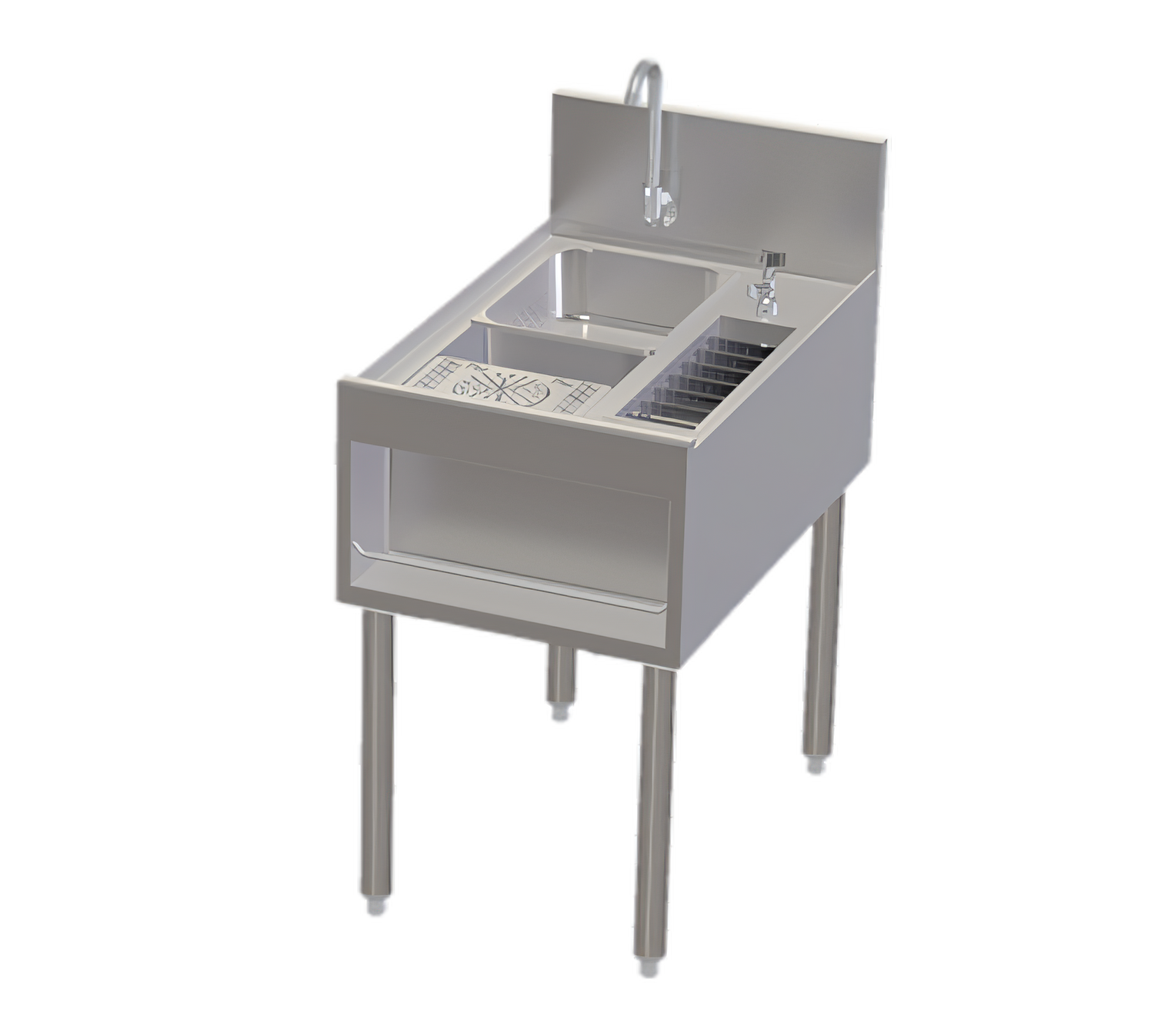 Tobin Ellis Signature Underbar Utility sink, with glass rinser & tool caddy, 18"W, freestanding, 6"H backsplash with 1" return, 9-1/2" wide x 16-5/16" front-to-back x 7-3/16" deep sink bowl with 1-1/2" drain, sound-deadened underside, integrated drip pan with 4-3/8" dia. stainless steel glass rinser (NSF) & "water fall" drainage into sink, includes removable perforated glass rack, 4-3/8" x 14-5/16 removable tool caddy well with low-lead dipper faucet (NSF), recessed cubby on front with wire bottle holder, stainless steel construction, stainless steel legs with adjustable thermoplastic feet