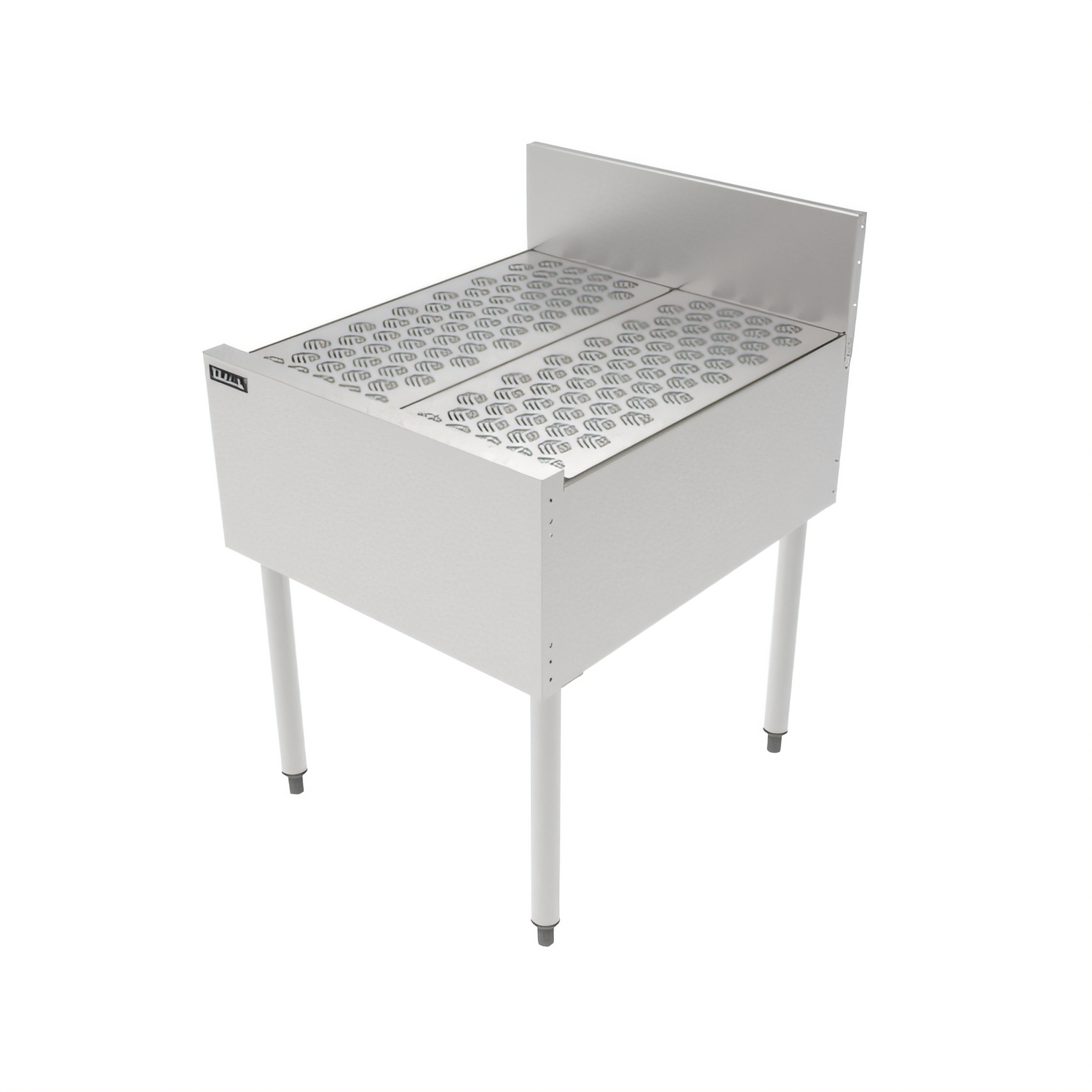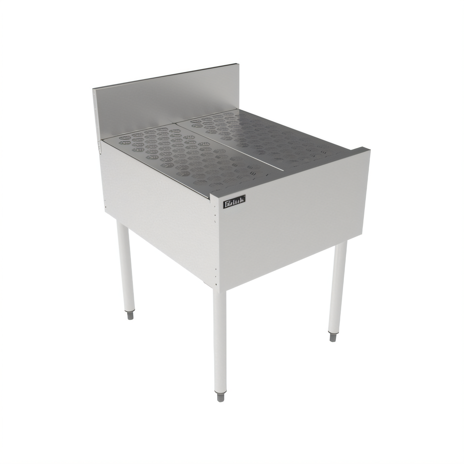TSCE Series Underbar Drainboard, 24"W x 27-5/8"D, pitched drainboard top, (2) 12"W 'Honeycomb' shaped 18 gauge stainless steel perforated glass rack insert, all stainless steel construction, backsplash, Perlick Quick Clamp tool less leg attachment, stainless steel legs with adjustable thermoplastic feet
