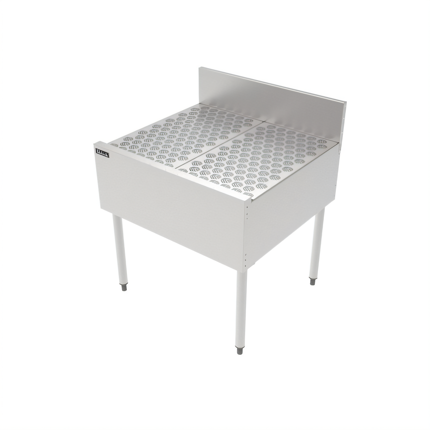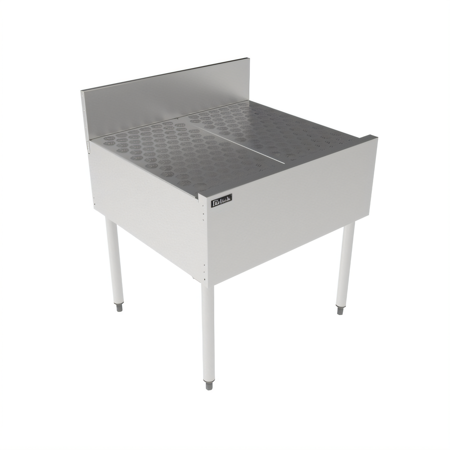 TSCE Series Underbar Drainboard, 30"W x 27-5/8"D, pitched drainboard top, (2) 15"W 'Honeycomb' shaped 18 gauge stainless steel perforated glass rack insert, all stainless steel construction, backsplash, Perlick Quick Clamp tool less leg attachment, stainless steel legs with adjustable thermoplastic feet