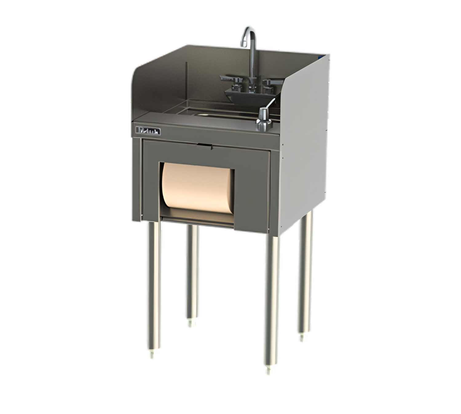 TSD Series Underbar Hand Sink Unit, free standing, 18"W x 30-3/8"D, stainless steel construction, galvanized steel back, 10" wide x 14" front-to-back x 9-1/4" deep sink, 6" backsplash, 4" OC deck mount faucet holes, 6" rear deck, side splashes on left & right, (16) oz. pump soap dispenser, paper towel dispenser on front apron accommodates 8"W roll, stainless steel hinged door with magnetic catches, sound-deadened underside, (1) 8-1/2" standpipe, 3/8" copper supply tubes, 1-1/2" NPS male drain, stainless steel legs with 1" adjustable thermoplastic feet, NSF