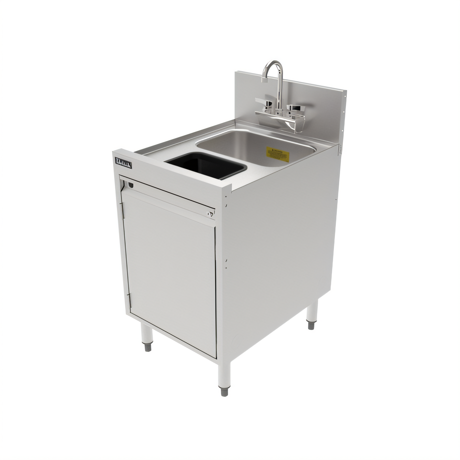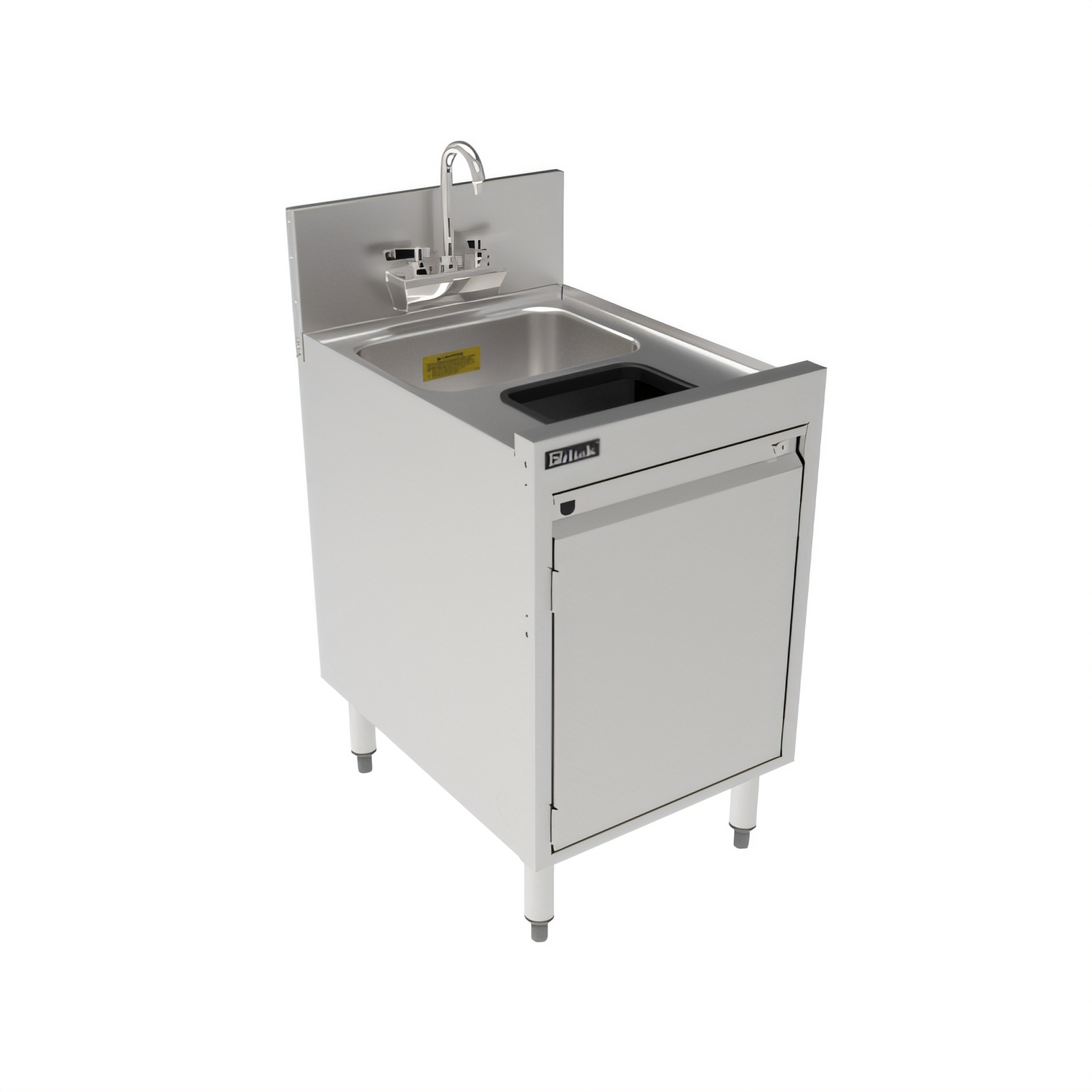 TSF Series Underbar Storage Cabinet Sink Unit with Waste Chute, 18"W x 24"D, 10" wide x 14" front-to-back x 9-1/2" deep 18 gauge stainless steel sink, 5" diameter waste chute with raised rim, 1-1/2" NPS male drain, stainless steel construction, Perlick Quick Clamp tool less leg attachment, stainless steel legs with 1" adjustable stainless steel feet
