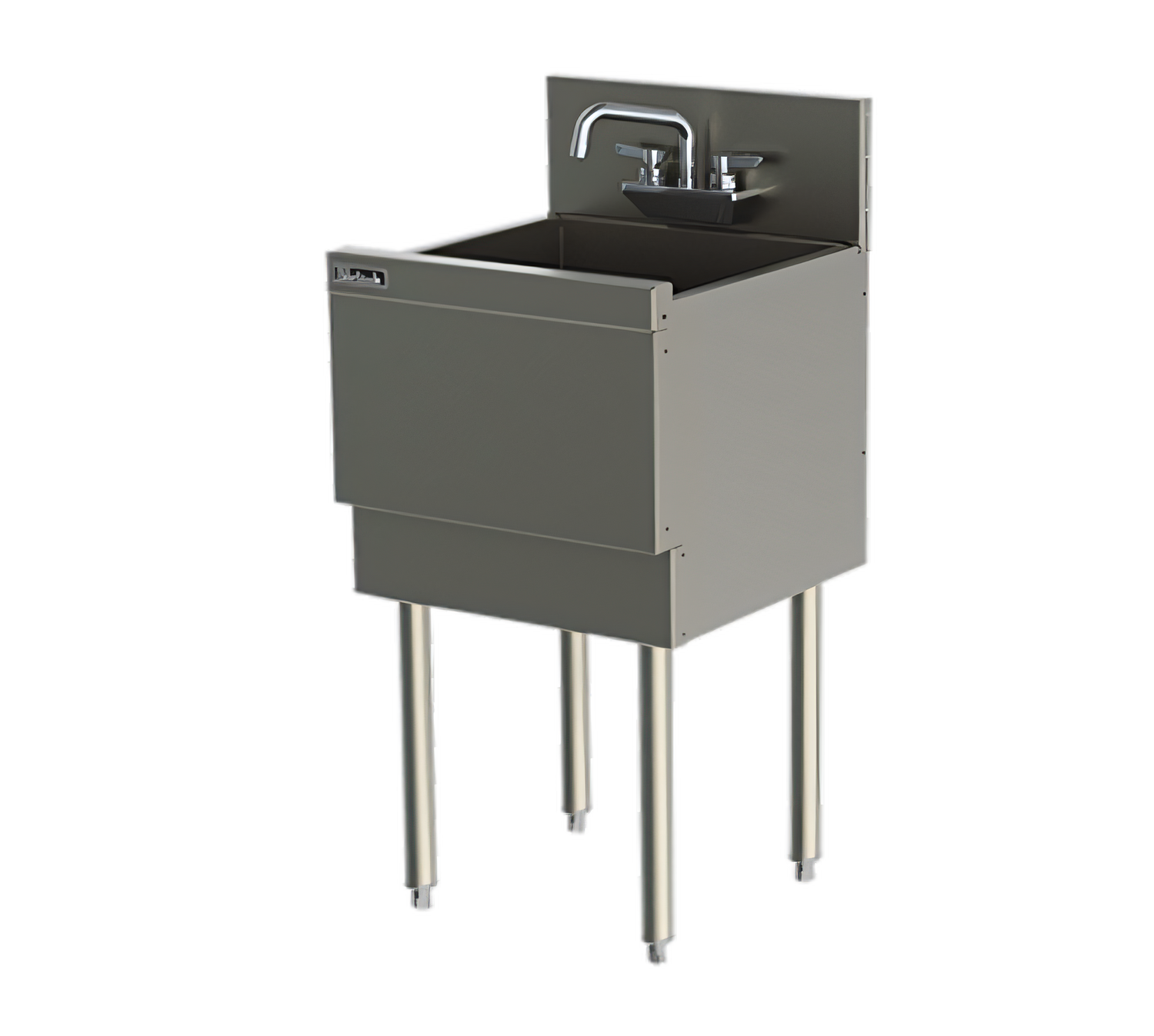 TSF Series Extra Capacity Underbar Sink Unit, one compartment, 18"W x 24"D, 4" or 6"H backsplash, 16-1/4" wide x 16" front-to-back x 15" deep compartment, 4" OC splash mount faucet holes (TS) or 4" OC deck mount faucet holes (TSF), apron on front & sides, sound-deadened underside, includes (1) 1-1/2" drain & (1) 12" standpipe, stainless steel construction, stainless steel legs with adjustable thermoplastic feet (replaces TSD181CA)