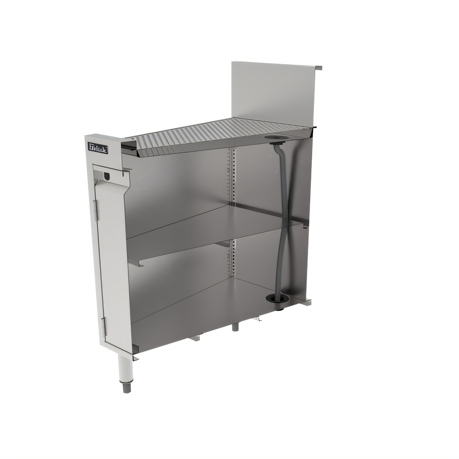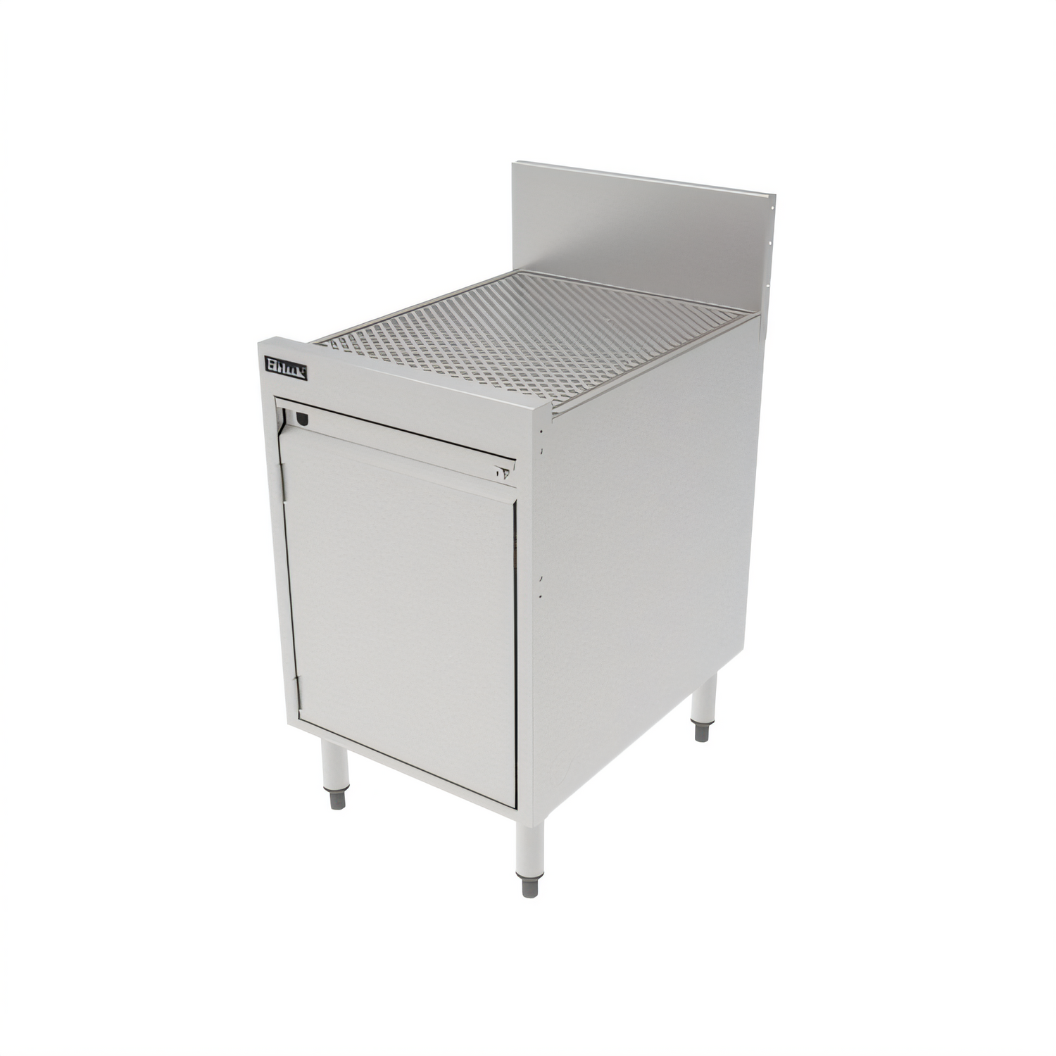 Underbar Storage Cabinet 18"W x 24"D, 4" or 6"H backsplash with 1" return at top, pitched drainboard top with 1-1/2" NPS drain socket with 1/2" OD barb & 1/2" ID anti-microbial tubing, 1-1/2" NPS male drain center back of cabinet bottom, (1) adjustable intermediate shelf, stainless steel construction, Perlick Quick Clamp stainless steel legs & adjustable feet, NSF Listed (replaces SC18)