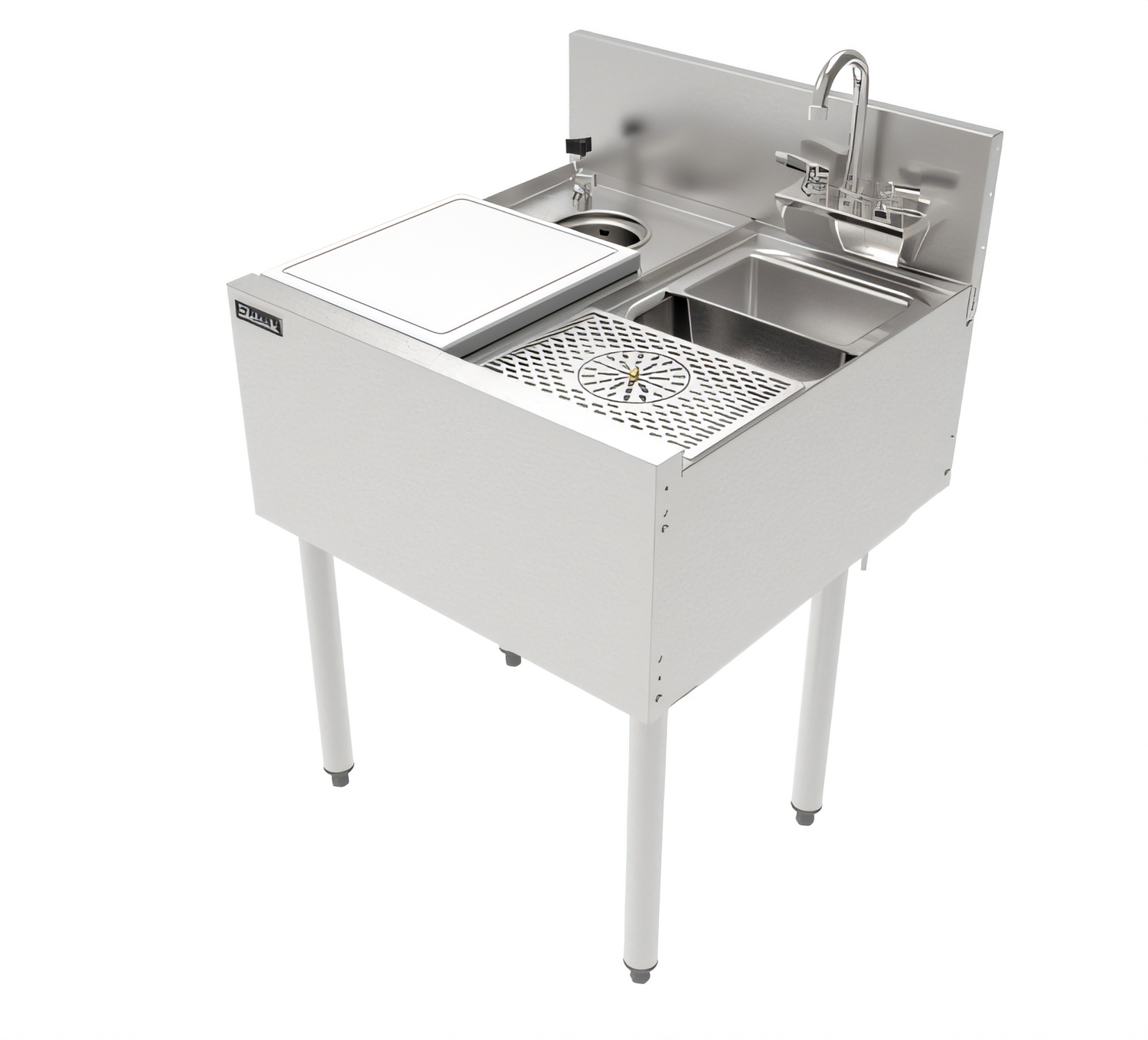 TSF Series Underbar Prep Sink, 24" W x 24" D x 36" H, with Sink bowl (9.75"W x 10.5" FTB x 6" D), Cutting board (11.75"W x 13"D), Glass Rinser (5" Diameter), & Tool well with faucet (5.5" Diameter)