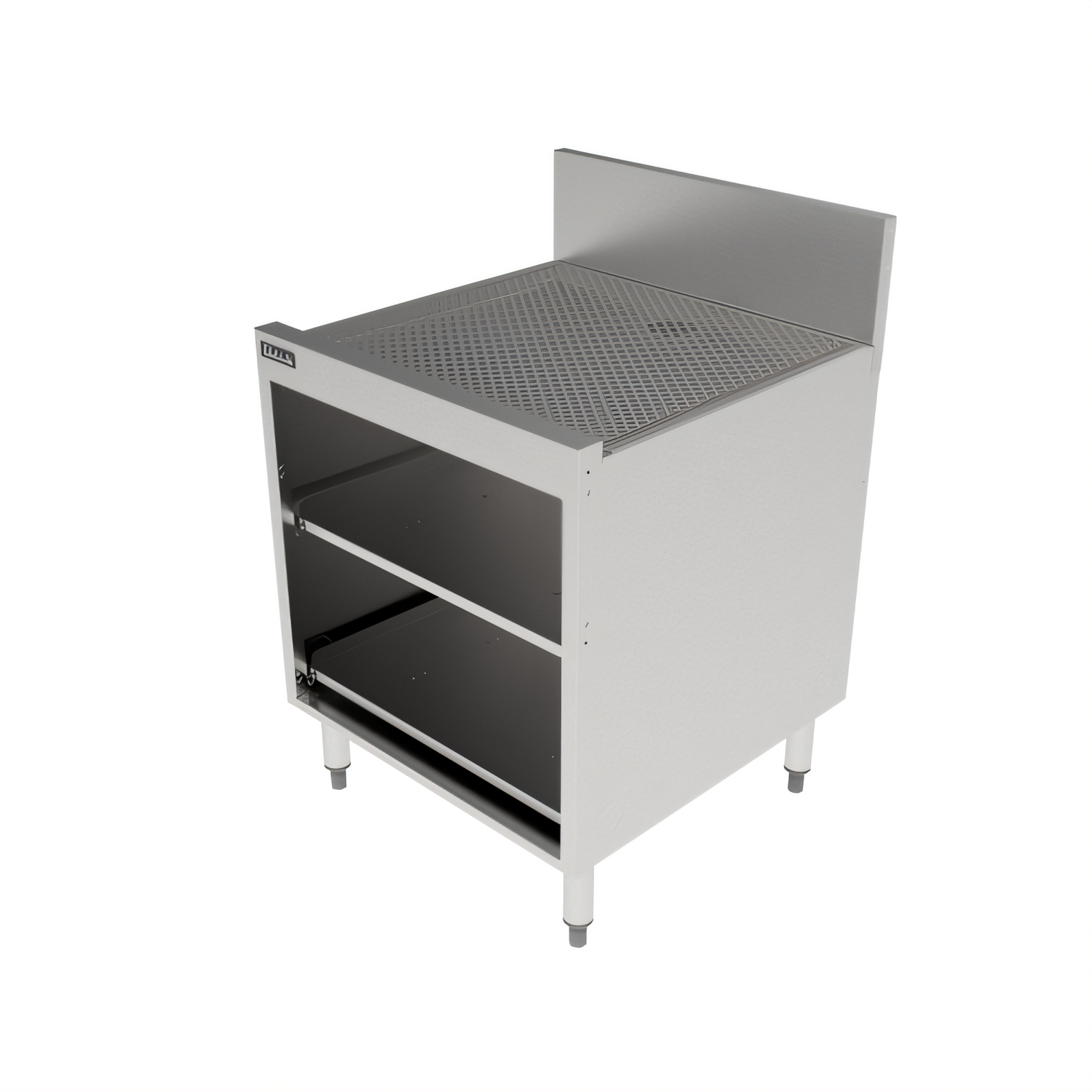 Underbar Storage Cabinet 24"W x 24"D, 4" or 6"H backsplash with 1" return at top, pitched drainboard top with 1-1/2" NPS drain socket with 1/2" OD barb & 1/2" ID anti-microbial tubing, 1-1/2" NPS male drain center back of cabinet bottom, (2) pitched and perforated adjustable glass rack shelves, stainless steel construction, Perlick Quick Clamp stainless steel legs & adjustable feet (replaces 7055A-D)