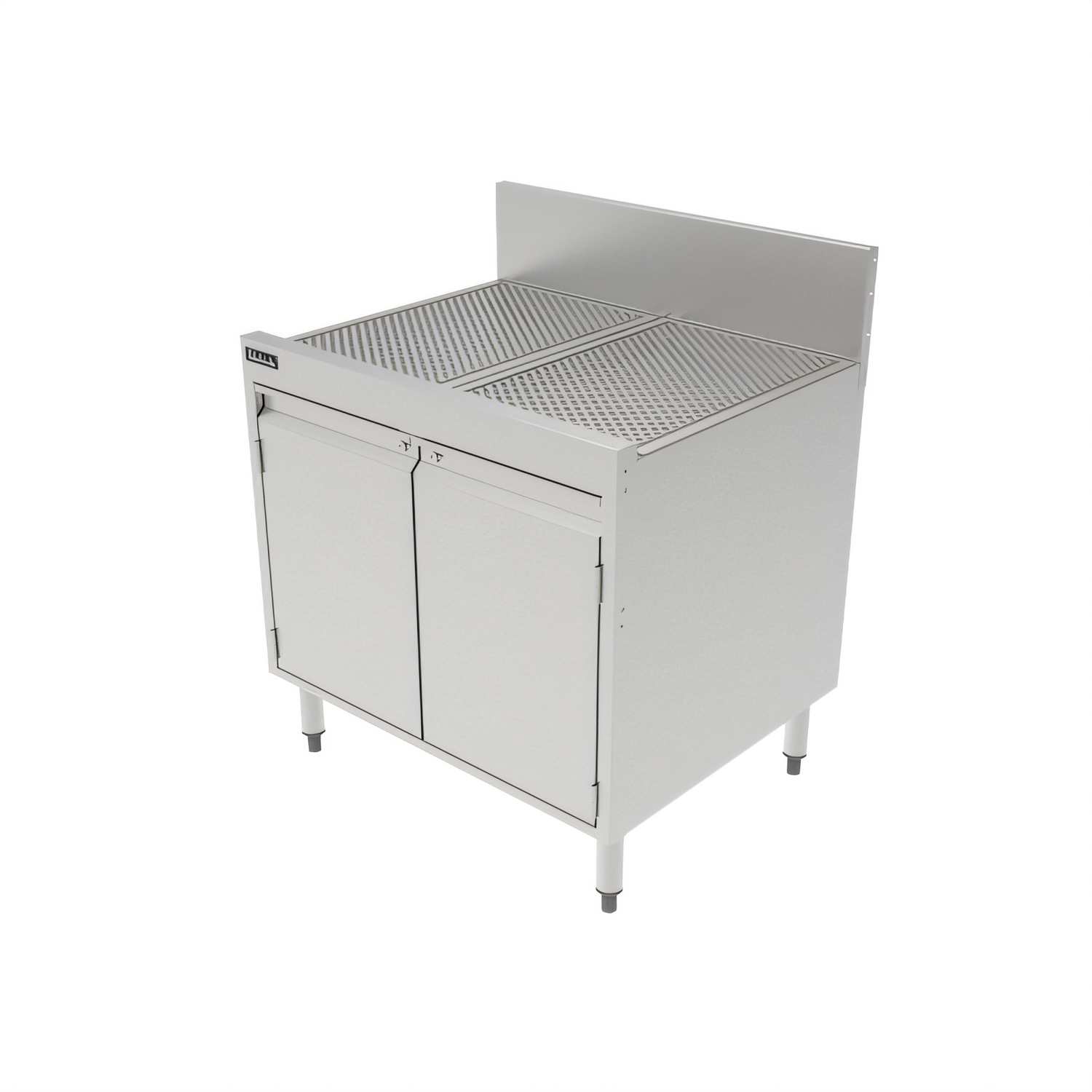 Underbar Storage Cabinet 30"W x 24"D, 4" or 6"H backsplash with 1" return at top, pitched drainboard top with 1-1/2" NPS drain socket with 1/2" OD barb & 1/2" ID anti-microbial tubing, 1-1/2" NPS male drain center back of cabinet bottom, (1) adjustable intermediate shelf, stainless steel construction, Perlick Quick Clamp stainless steel legs & adjustable feet, NSF Listed (replaces SC30)