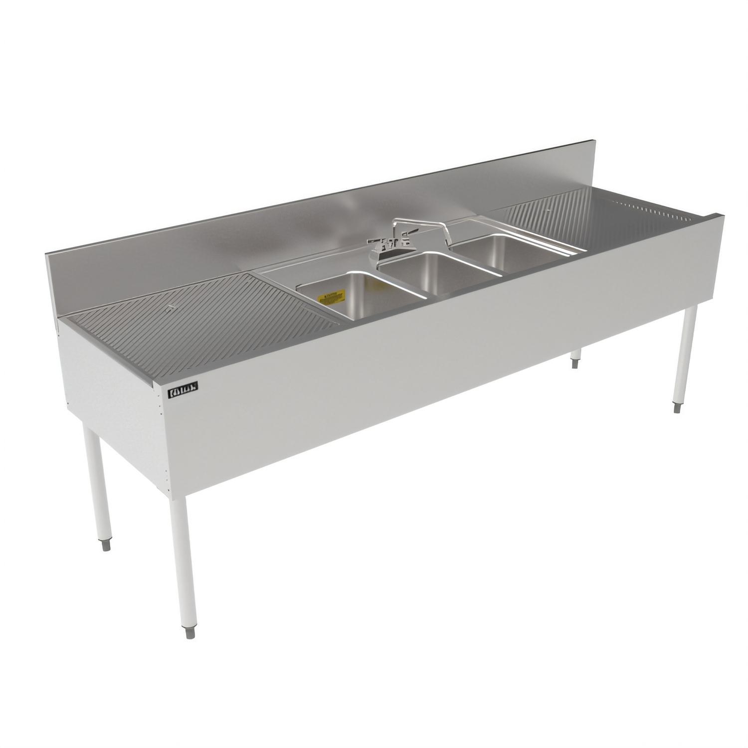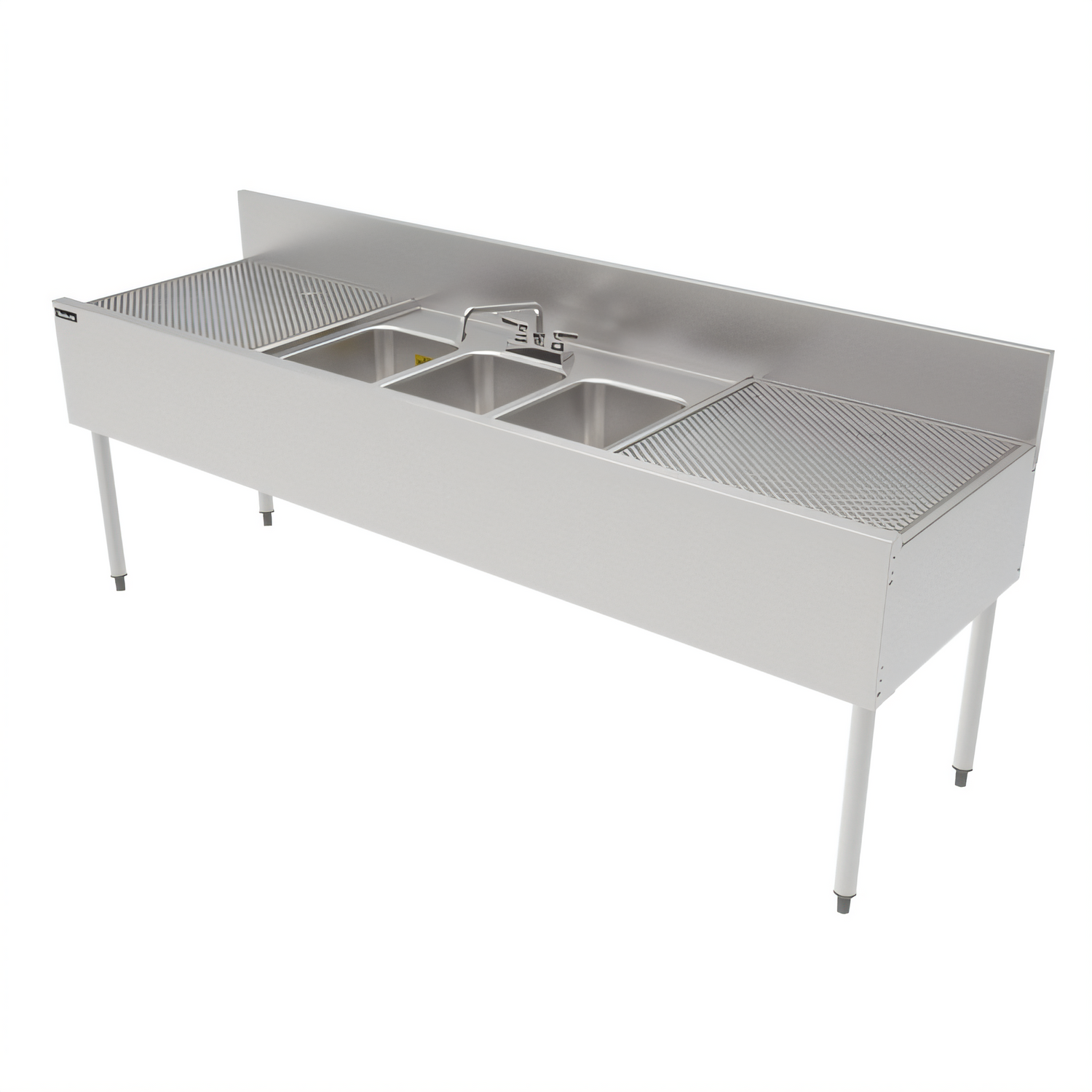 TSF Series Underbar Multi-tank Sink Unit, three 18 gauge stainless steel compartment, 84"W x 24"D, backsplash, 10" wide x 14" front-to-back x 9-1/4" deep compartments, 24" pitched drainboard top on left & right, 4" OC (TS) splash or (TSF) deck mount faucet holes, seamless 18 gauge stainless steel front apron, includes 1-1/2" drains & 8-1/2" removable overflow standpipes, stainless steel construction, Perlick Quick Clamp tool less leg attachment, stainless steel legs with adjustable thermoplastic feet (replaces TSD73C)