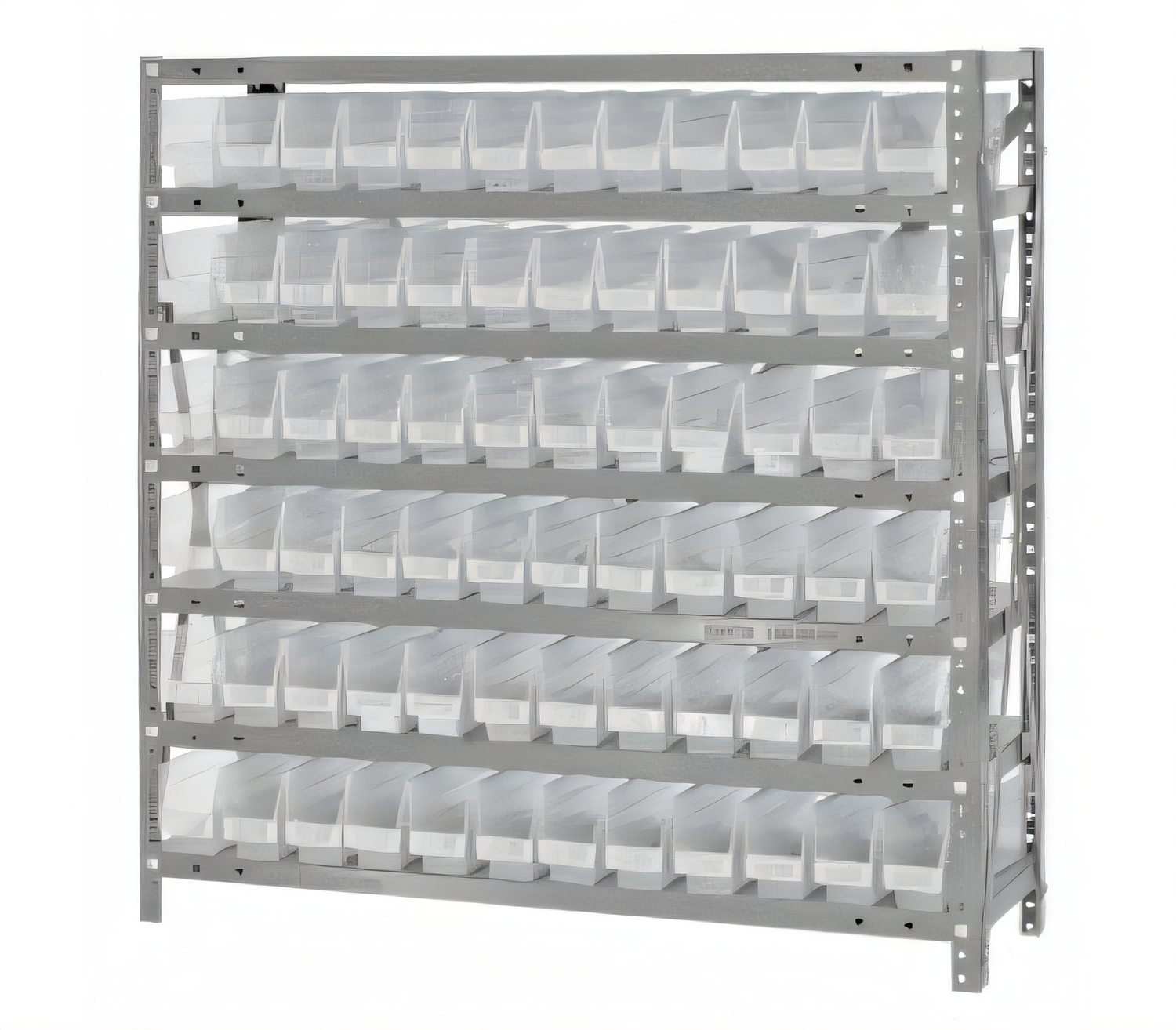 Shelving Unit, 12"D x 36"L x 39"H, heavy duty, 400 lb. load capacity per shelf, includes: (7) shelves, (72) 11-5/8"L x 2-3/4"W x 4"H (QSB100) clear bins, uprights and cross bars, smooth powder-coat finish