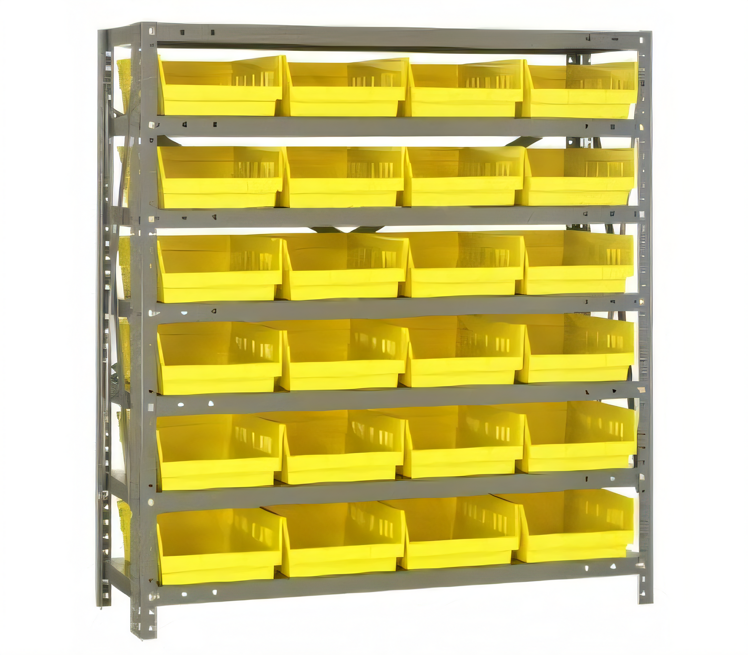 Shelving Unit, 12"D x 36"L x 39"H, heavy duty, 400 lb. load capacity per shelf, includes: (7) shelves, (24) 11-5/8"L x 8-3/8"W x 4"H (QSB107) bins available in multiple colors, uprights and cross bars, smooth powder-coat finish