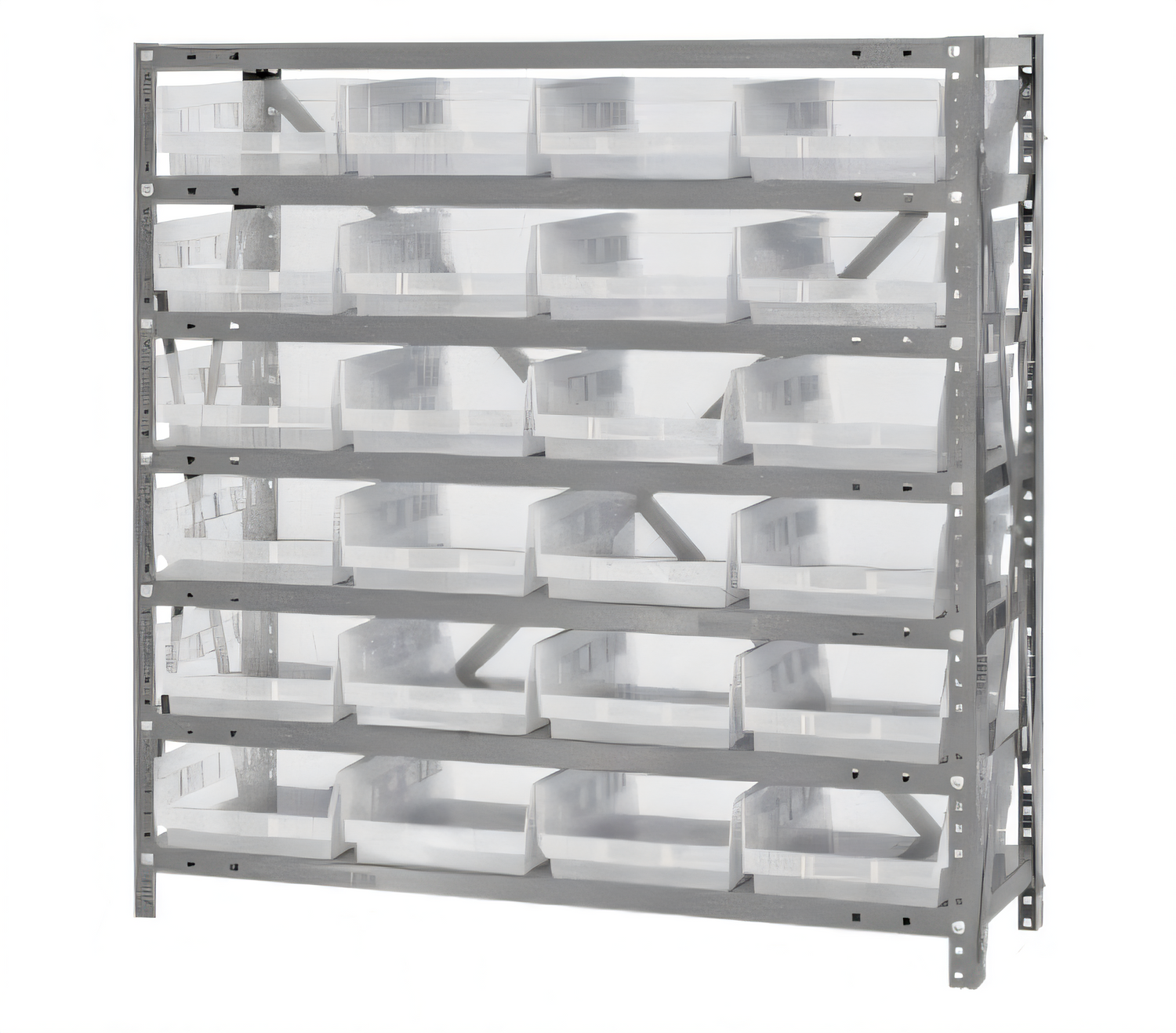 Shelving Unit, 12"D x 36"L x 39"H, heavy duty, 400 lb. load capacity per shelf, includes: (7) shelves, (24) 11-5/8"L x 8-3/8"W x 4"H (QSB107) clear bins, uprights and cross bars, smooth powder-coat finish
