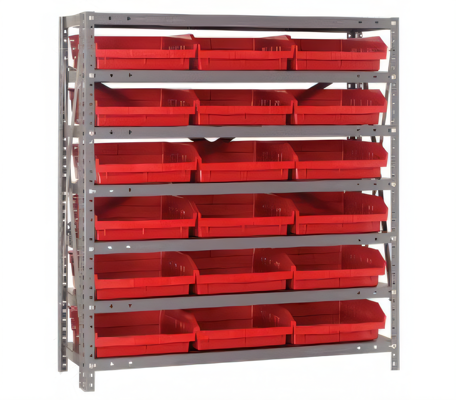 Shelving Unit, 12"D x 36"L x 39"H, heavy duty, 400 lb. load capacity per shelf, includes: (7) shelves, (18) 11-5/8"L x 11-1/8"W x 4"H (QSB109) bins available in multiple colors, uprights and cross bars, smooth powder-coat finish