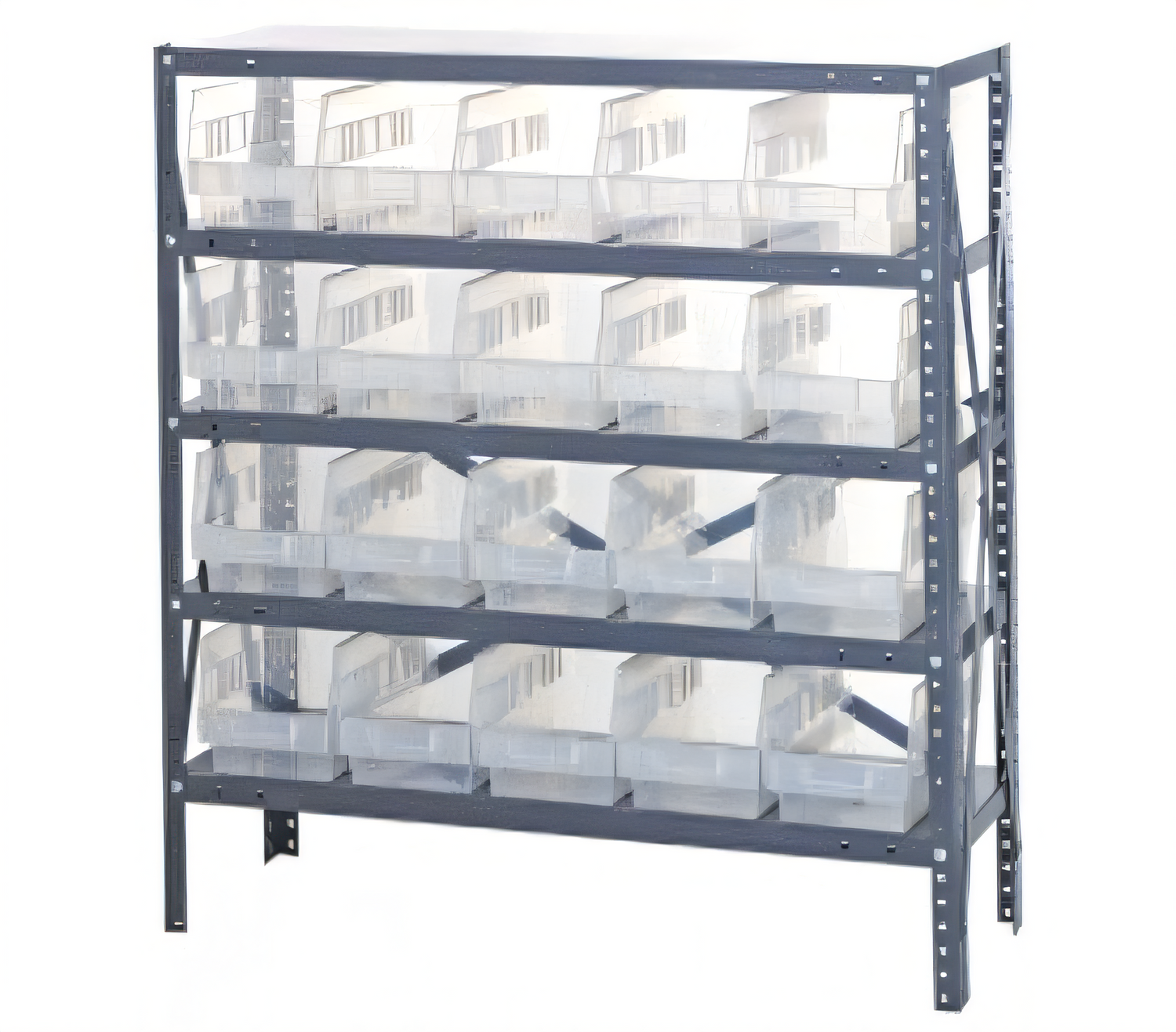 Shelving Unit, 12"D x 36"L x 39"H, heavy duty, 400 lb. load capacity per shelf, includes: (5) shelves, (20) 11-5/8"L x 6-5/8"W x 6"H (QSB202) clear bins, uprights and cross bars, smooth powder-coat finish