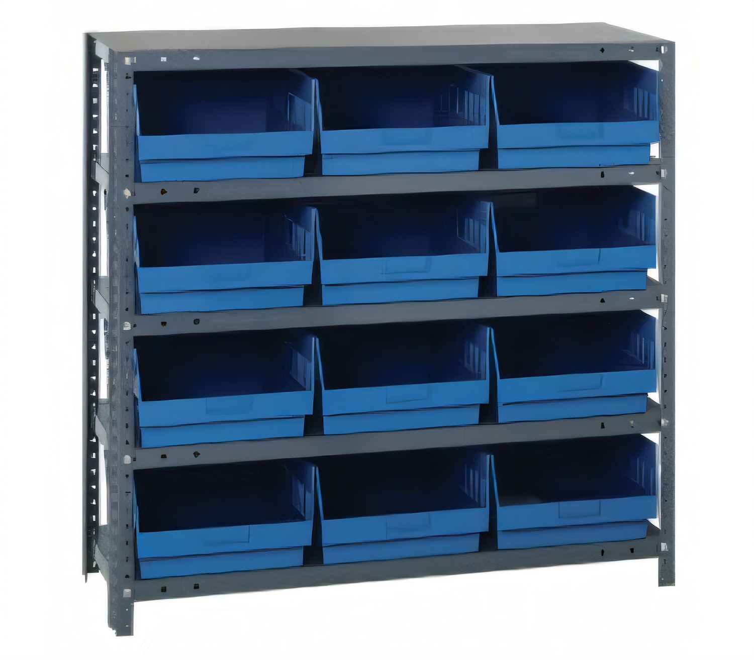 Shelving Unit, 12"D x 36"L x 39"H, heavy duty, 400 lb. load capacity per shelf, includes: (5) shelves, (12) 11-5/8"L x 11-1/8"W x 6"H (QSB209) bins available in multiple colors, uprights and cross bars, smooth powder-coat finish
